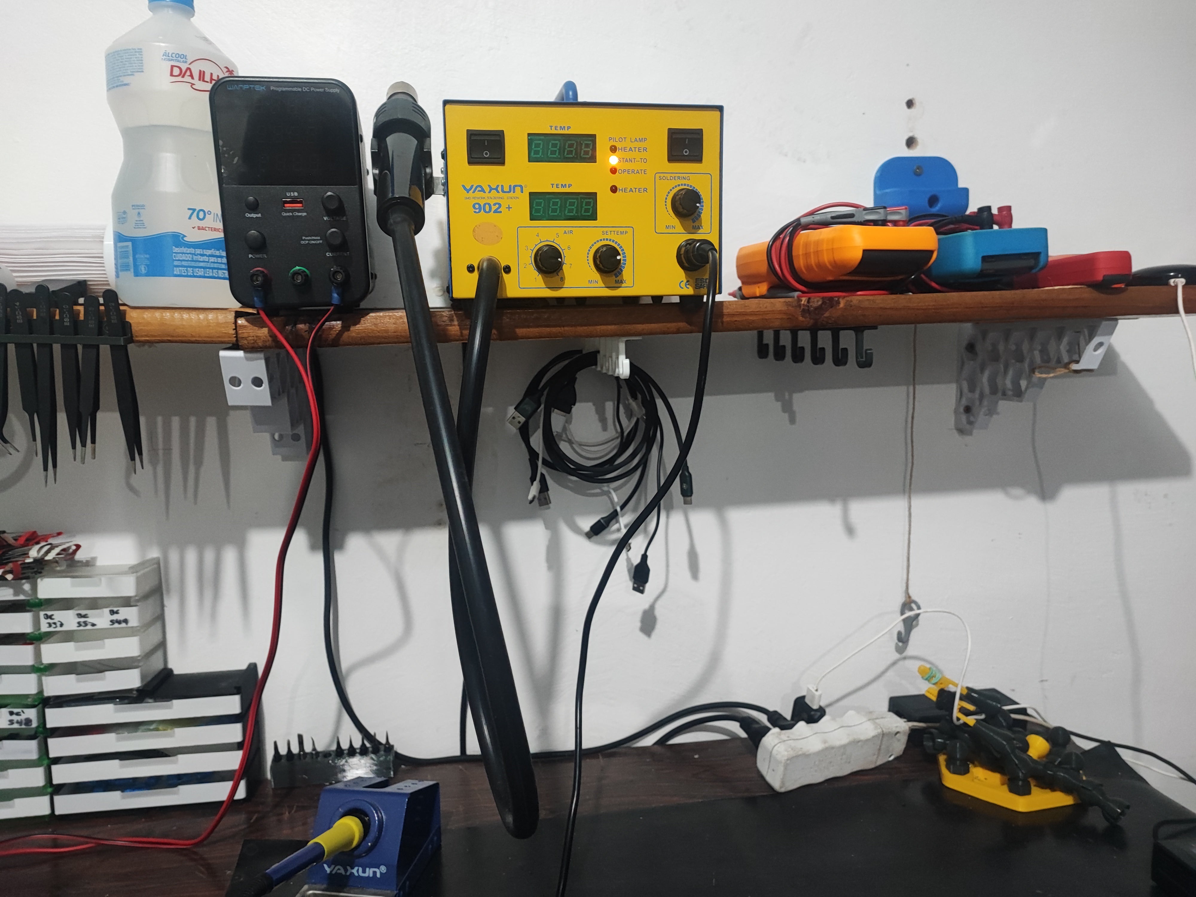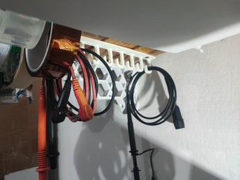 Denna kabelhållare och krok för underhyllorna erbjuder en praktisk lösning för att organisera dina kablar och sladdar under ditt skrivbord eller hyllor. Med detta kabelupphängningsalternativ kan du enkelt hålla din arbetsyta snygg och fri från skräp. Genom att placera den diskret under en hylla skapar du ett mer harmoniskt och hanterbart utrymme, där kablarna är dolda, men ändå lättillgängliga. Denna design är särskilt användbar på till exempel en elektronikarbetsbänk eller på hemmakontoret, där en välorganiserad arbetsyta är avgörande. Produkten hjälper till att hålla dina elanslutningar prydliga och säkra, och fungerar som en effektiv sladdhållare för att undvika trassliga sladdar.