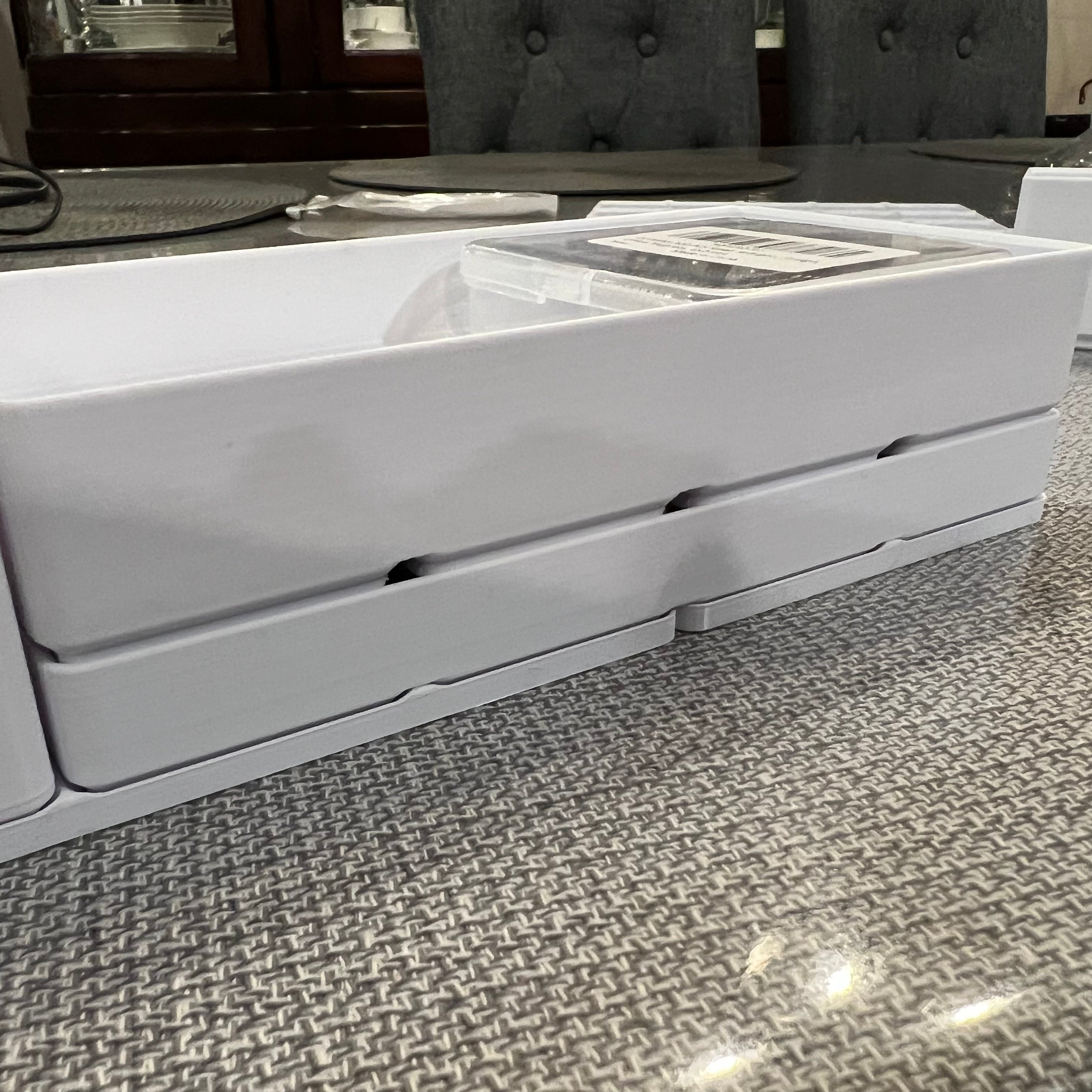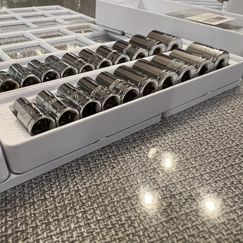 Denna organisatör är utformad för att hålla 1/4" hylsnycklar från ett Harbor Freight-set och erbjuder en strukturerad förvaringslösning. Den är kompatibel med Gridfinity-systemet, vilket möjliggör en organiserad och modulär uppställning i din verktygslåda eller låda. Hållaren är tillverkad med exakta mått som säkerställer att dina SAE- och metriska hylsnycklar sitter säkert på plats utan att rulla runt, samtidigt som den är enkel att ta bort. Djupet på denna modul är optimerat så att du kan placera ytterligare Gridfinity-förvaringslösningar ovanpå, vilket maximerar ditt 1x4-utrymmesutnyttjande. Den stöder ett brett utbud av hylsstorlekar, inklusive de vanligaste SAE- (3/16" till 9/16") och metriska (5 mm till 14 mm) storlekarna.