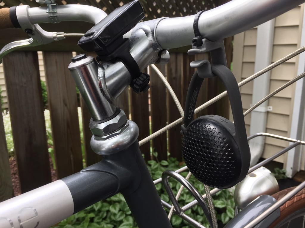 Fästet håller högtalaren säkert på plats och förhindrar att den glider ner längs styret och träffar styrröret. Samtidigt är designen gjord så att det är enkelt att montera och ta bort högtalaren efter behov. Installationen är enkel och kräver bara ett enda buntband för att fästa hållaren ordentligt på cykelstyret.