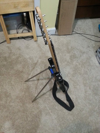 Stativet erbjuder en praktisk förvaringslösning som hjälper till att skydda instrumentet från fall och skador. För extra stabilitet ingår ett litet klämma som diskret kan fästas på gitarren, vilket ger ett ännu säkrare stöd.