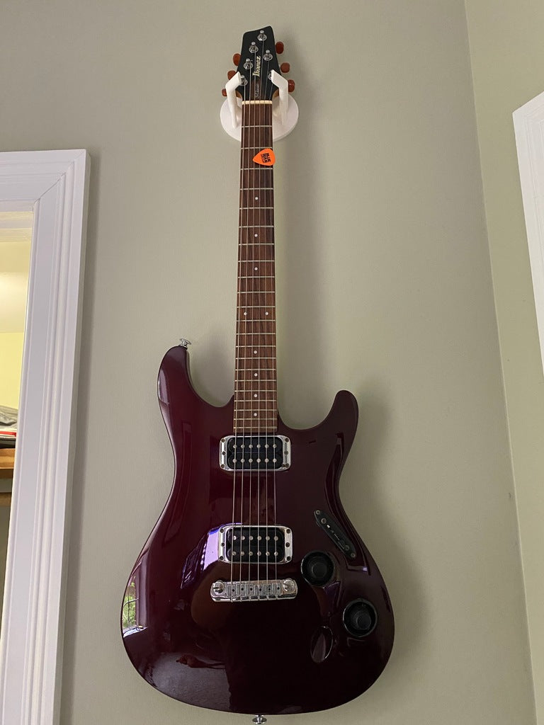 Detta funktionella väggfäste för gitarr erbjuder en elegant och platsbesparande lösning för förvaring av ditt musikinstrument. Genom att montera din gitarr på väggen får du inte bara ett snyggt utrymme, utan också en dekorativ uppvisning av ditt instrument, som alltid finns inom räckhåll. Detta väggfäste för gitarr är lämpligt för lätta elgitarrer. Om du vill hänga upp tyngre modeller, som en Les Paul, rekommenderas det att använda ett material som ger ökad styrka för att säkerställa optimalt och stabilt stöd för din gitarr. Med detta väggfäste för gitarr blir ditt instrument en integrerad del av rummets inredning.