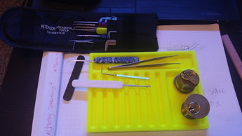 Denna praktiska låda är utformad för att effektivisera processen med att serva eller omlåsa lås. Den har flera specialdesignade spår som gör det enkelt att organisera och separera låsstift, fjädrar och andra små komponenter. Genom att hålla alla delar sorterade och lättåtkomliga bidrar lådan till en mer effektiv och exakt hantering av låsmekanismer. Det är ett användbart verktyg för alla som arbetar med lås och vill hålla koll på de många små, viktiga delarna.