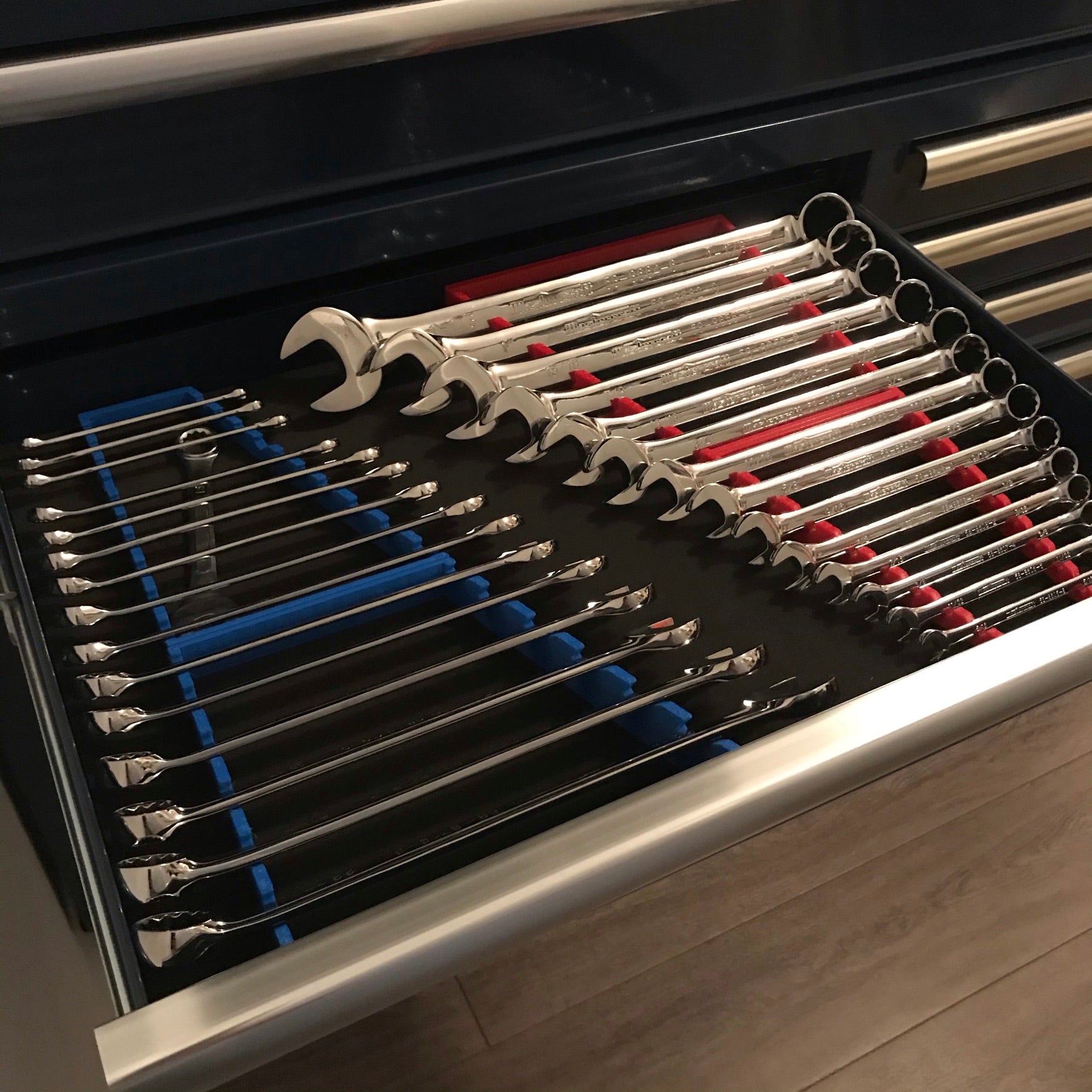 Denna platsbesparande organiseringssats är utformad för att hålla dina ringmutternycklar organiserade och lättillgängliga i din verktygslåda. Ingen mer tid slösad på att leta efter rätt nyckel; med detta system har varje verktyg sin permanenta plats.