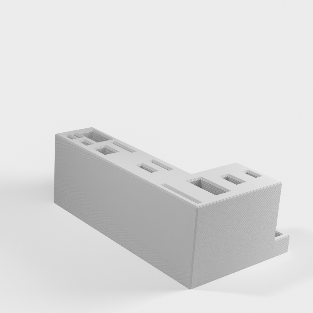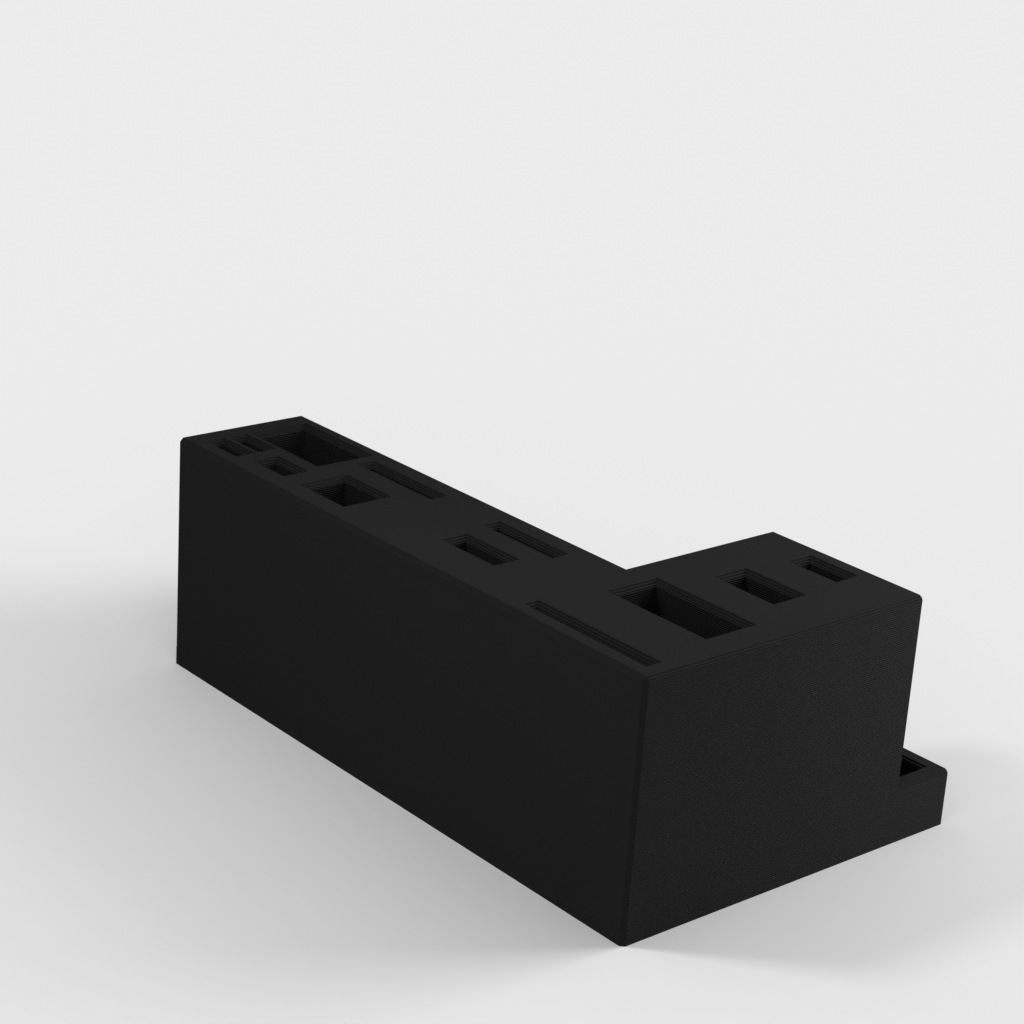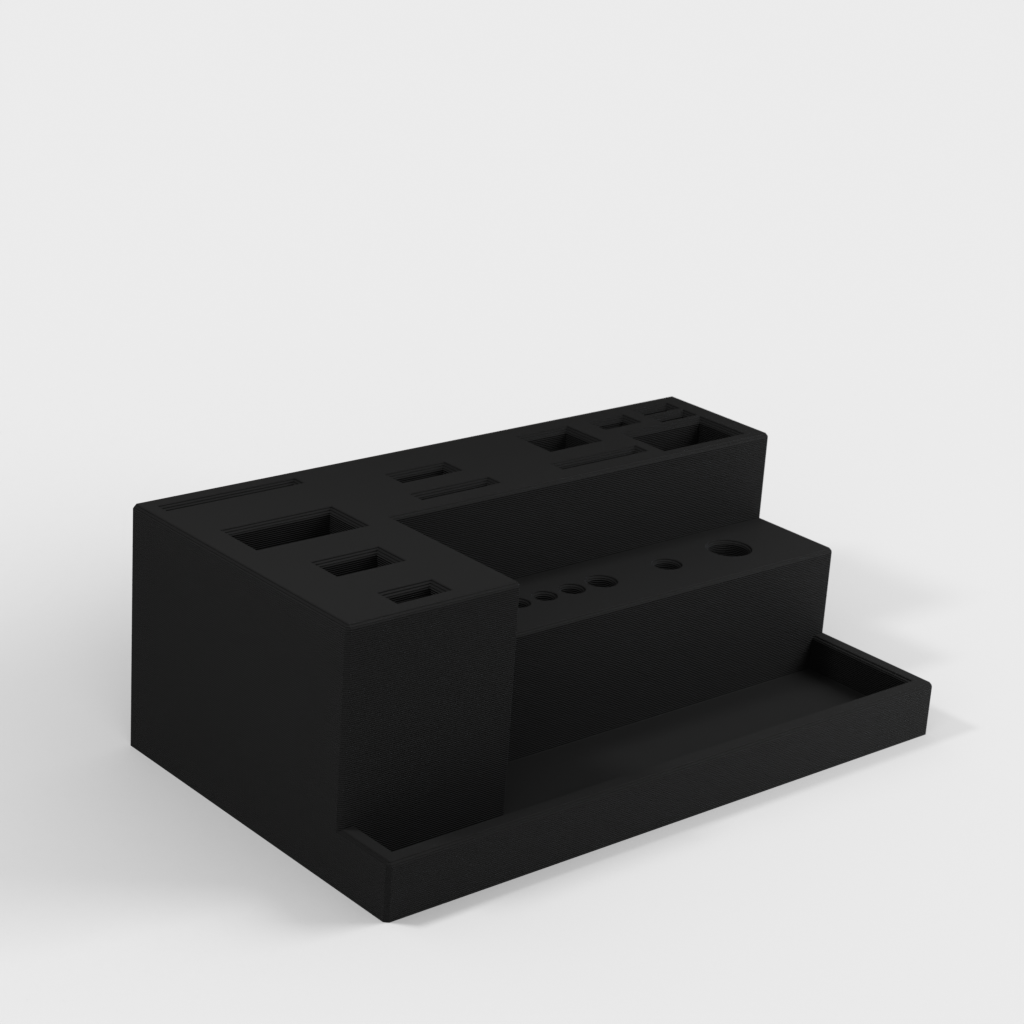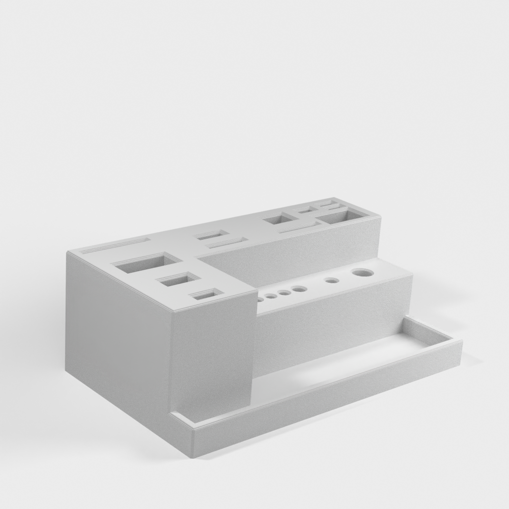 Verktygshållaren är utrustad med en praktisk bricka framtill, perfekt för förvaring av mindre delar som skruvar eller munstycken, vilket säkerställer att dessa ofta använda föremål finns nära till hands. Produkten är konstruerad för att tillverkas i robusta material som PLA eller PETG, vilket ger en hållbar lösning för daglig användning i din 3D-utskriftsmiljö.