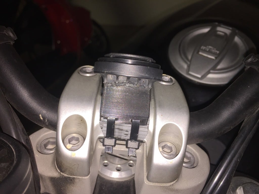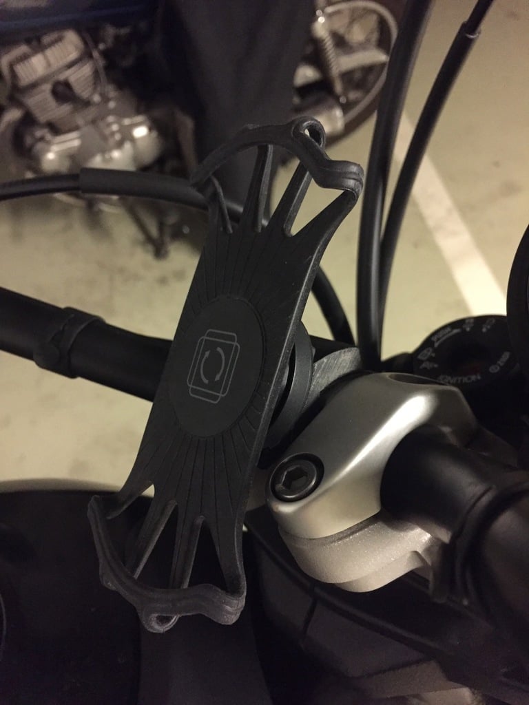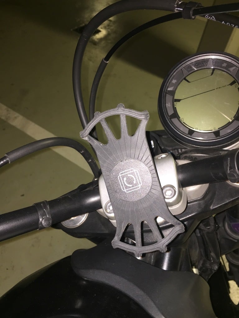 Din smartphone hålls säkert på plats med fyra starka gummiband som greppar varje hörn av telefonen. Den medföljande plattan monteras sedan på en robust bas som diskret fästs på ditt motorcykelstyre . En praktisk funktion är att plattan enkelt kan tas bort och roteras, vilket ger optimal sikt och flexibilitet under körning.