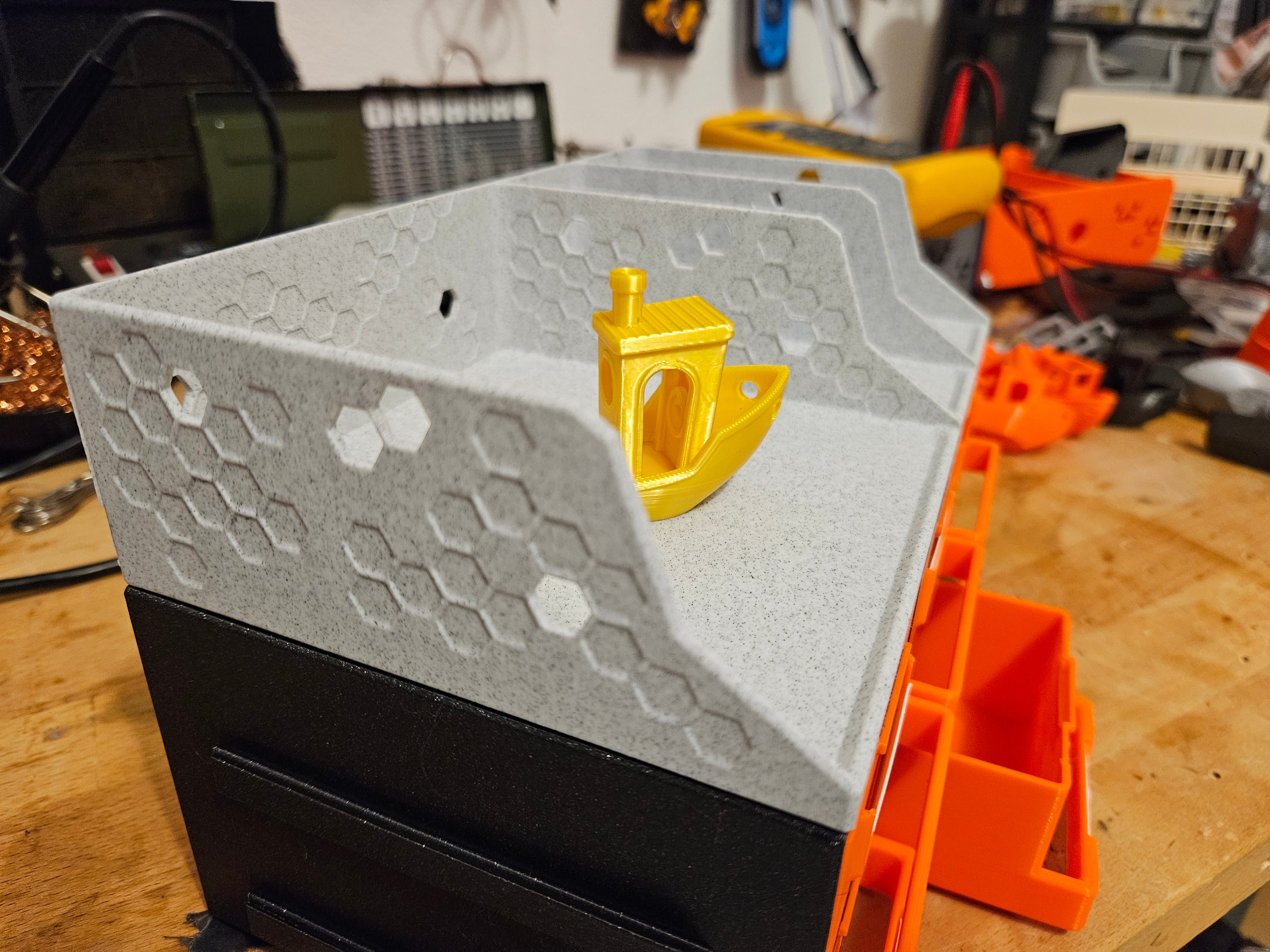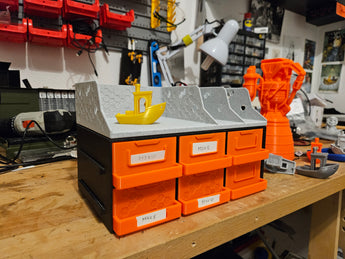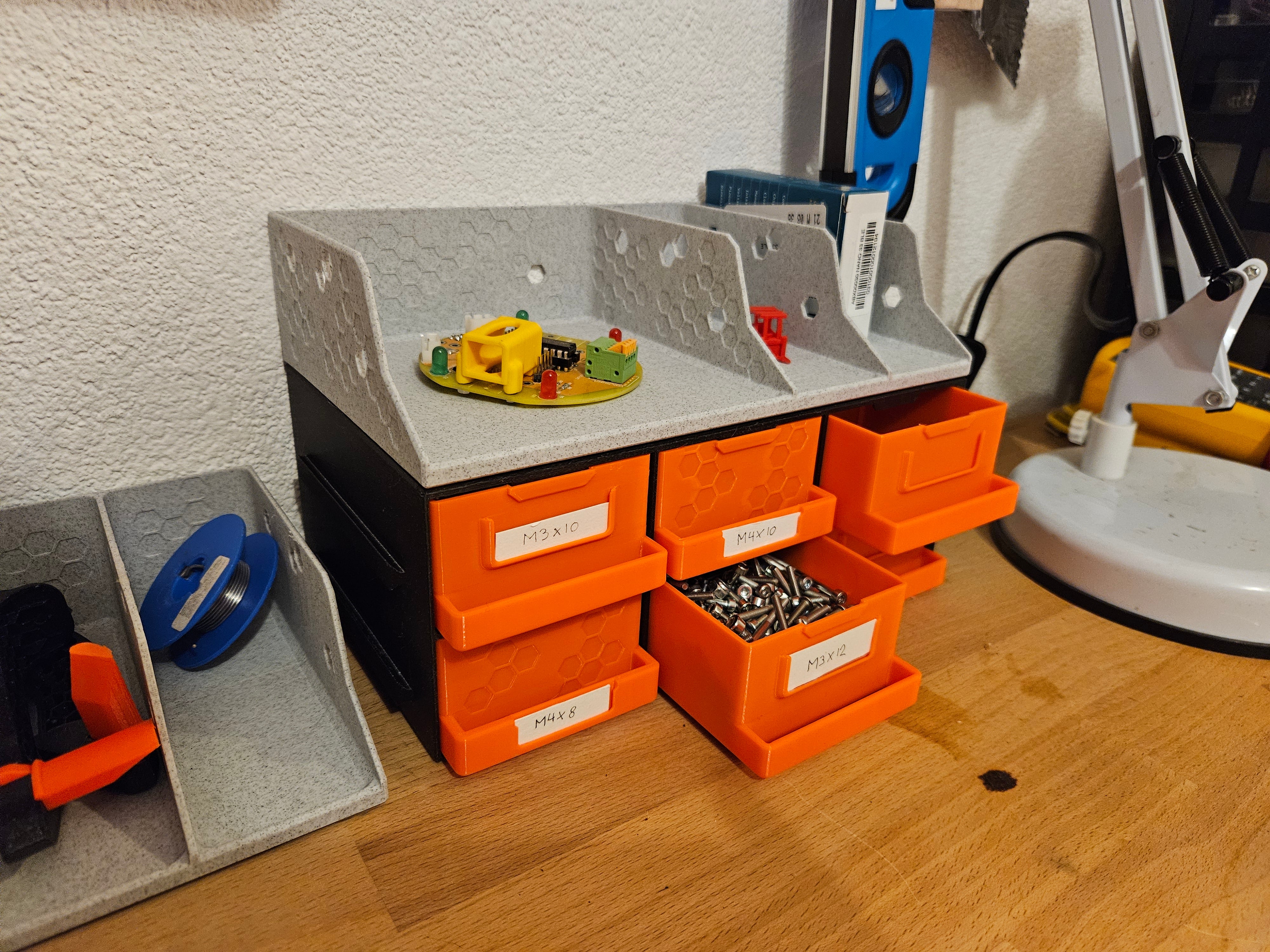 Detta modulära lådskåp är utformat för att skapa ordning och effektivitet i din verkstad, hobbyrum eller andra utrymmen där smådelar och verktyg behöver hållas organiserade. Systemet består av stapelbara hyllor och lådor med flexibla avdelare, vilket gör att du kan anpassa förvaringen exakt efter dina behov. Oavsett om du behöver förvara skruvar, elektroniska komponenter, hantverksmaterial eller till och med en elektrisk skruvmejsel och dess bits, erbjuder detta skåp en praktisk lösning. Lådorna är utrustade med ett smart halkskyddssystem som förhindrar att de faller ut när du flyttar hyllorna. För ytterligare bekvämlighet kan du använda de integrerade etikettfälten för antingen pappersetiketter eller 3D-utskrivna etiketter, så att du snabbt kan identifiera innehållet. Med olika hyllkonfigurationer, inklusive 3x4, 3x3 och 3x2 lådor, kan du skapa en skräddarsydd förvaringslösning som maximerar ditt utrymmesutnyttjande. Detta är en idealisk organisationslösning för dig som letar efter en strukturerad miljö där allt har sin plats.