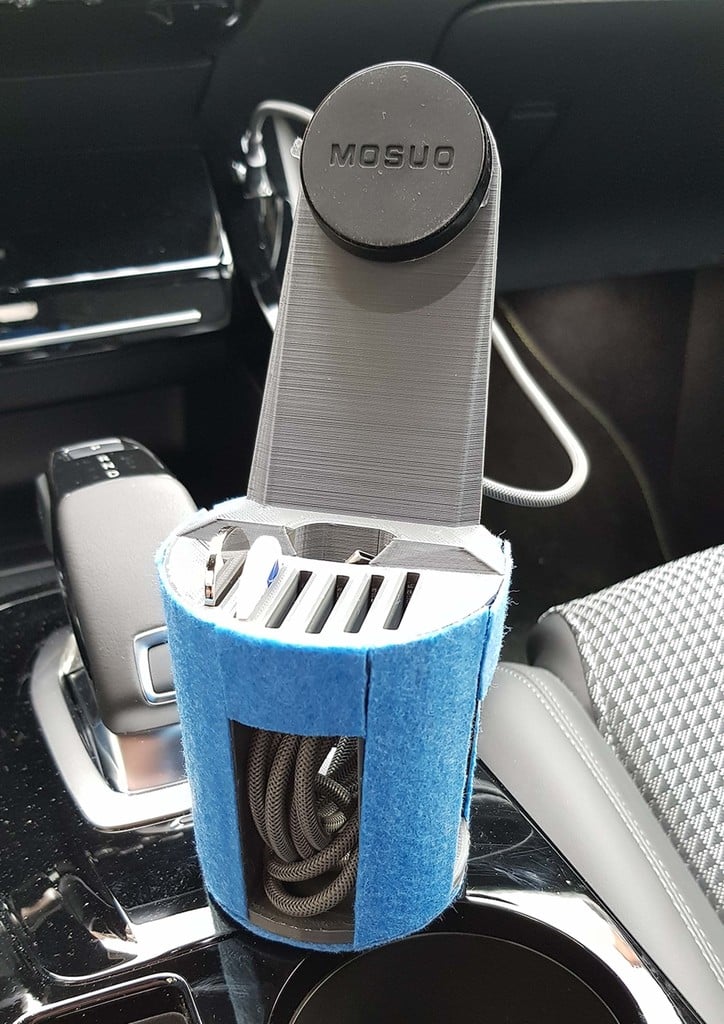 Förutom telefonförvaring inkluderar designen sex myntfack som kan användas för praktisk förvaring av småmynt, t.ex. för parkering eller vägtullar. Produkten är utformad för att passa exakt i bilens befintliga mugghållare, och ett filtark kan läggas till för en ännu mer optimal passform.