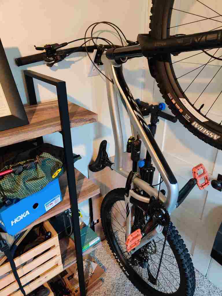 Väggfäste för en 2020 Ibis Ripmo AF mountainbike. Detta fäste är utformat så att cykeln vilar nära väggen medan bakhjulet vilar på marken. Det är en robust utrustning som enkelt kan hantera din cykels vikt. Kan monteras med hjälp av sidofästena. Kompatibel med Ripmo AF-modellerna.