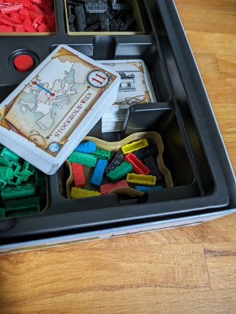 Genom att använda den här organisationslösningen utnyttjas utrymmet i spellådan optimalt och dina spelkomponenter är prydligt samlade och organiserade . Det är en funktionell låda som hjälper till att hålla ditt Ticket To Ride -spel snyggt och klart att använda, så att du kan fokusera helt på ruttnätverket och strategin.