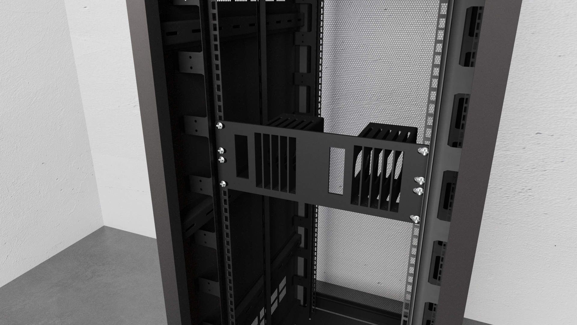 - Lösningen säkerställer en snygg installation av hårdvara i standard 10-tums rackskåp.