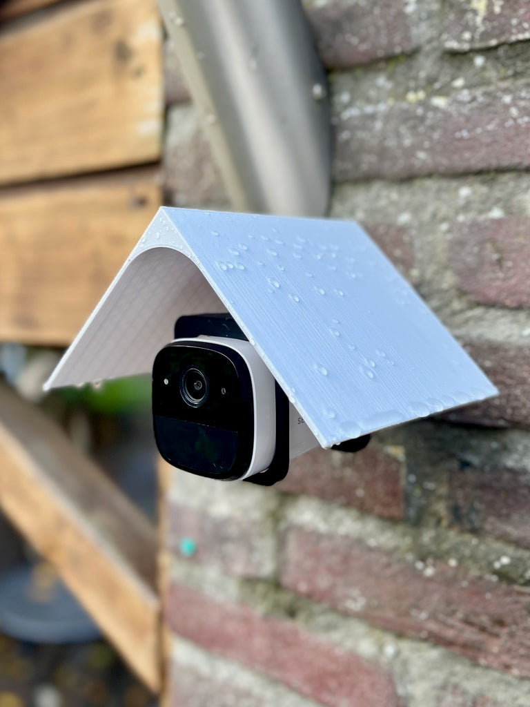 Detta är ett regnskydd för EufyCam 2 Pro säkerhetskamera. Även om EufyCam 2 Pro-modellerna är designade för att vara väderbeständiga, tål de inte direkt regn. Med detta regnskydd kan du skydda din kamera från direkt regn. Regnskyddet är utformat för att glida in i två ringar som ansluter till en separat taksektion. Friktionen mellan ringarna och kameran håller enheten på plats.