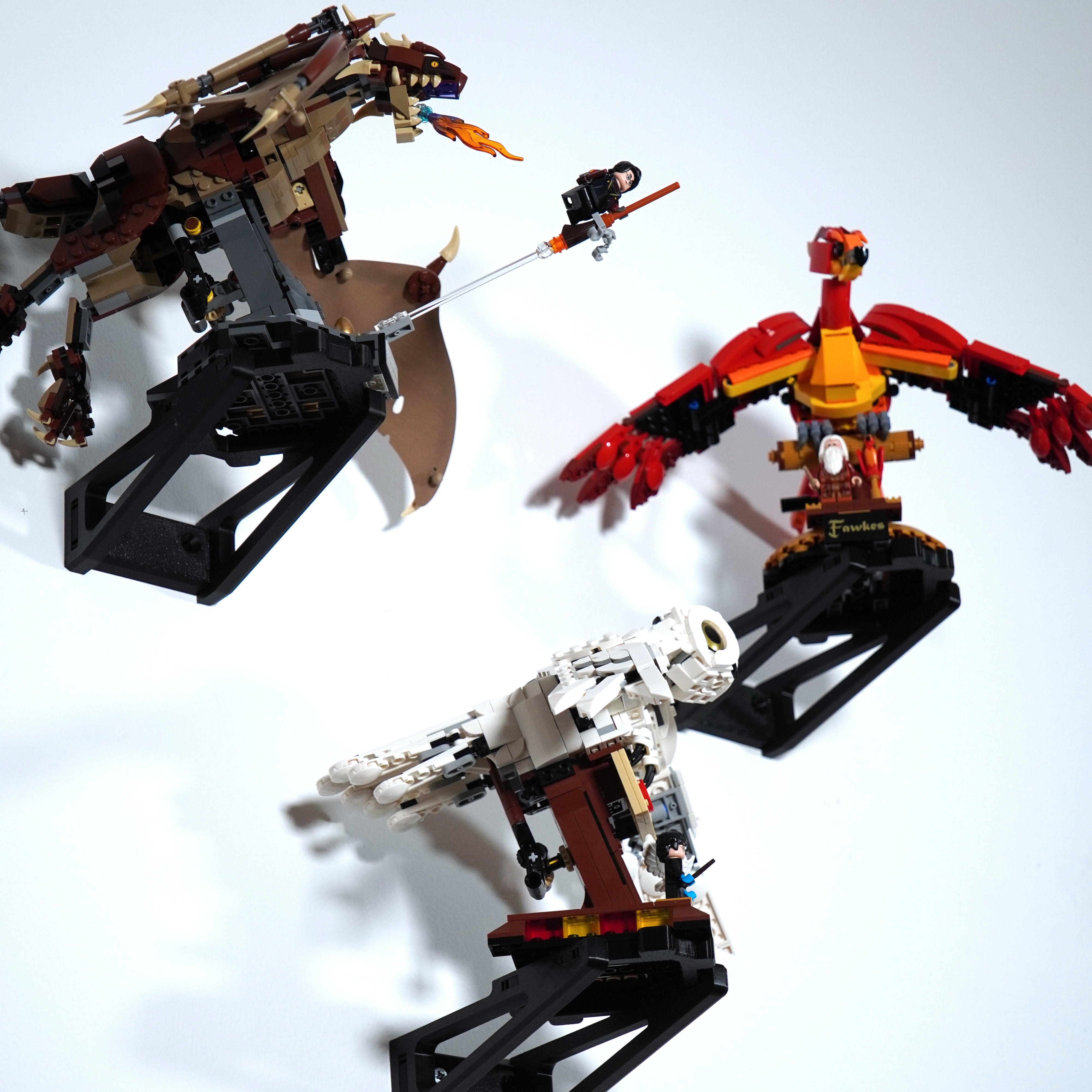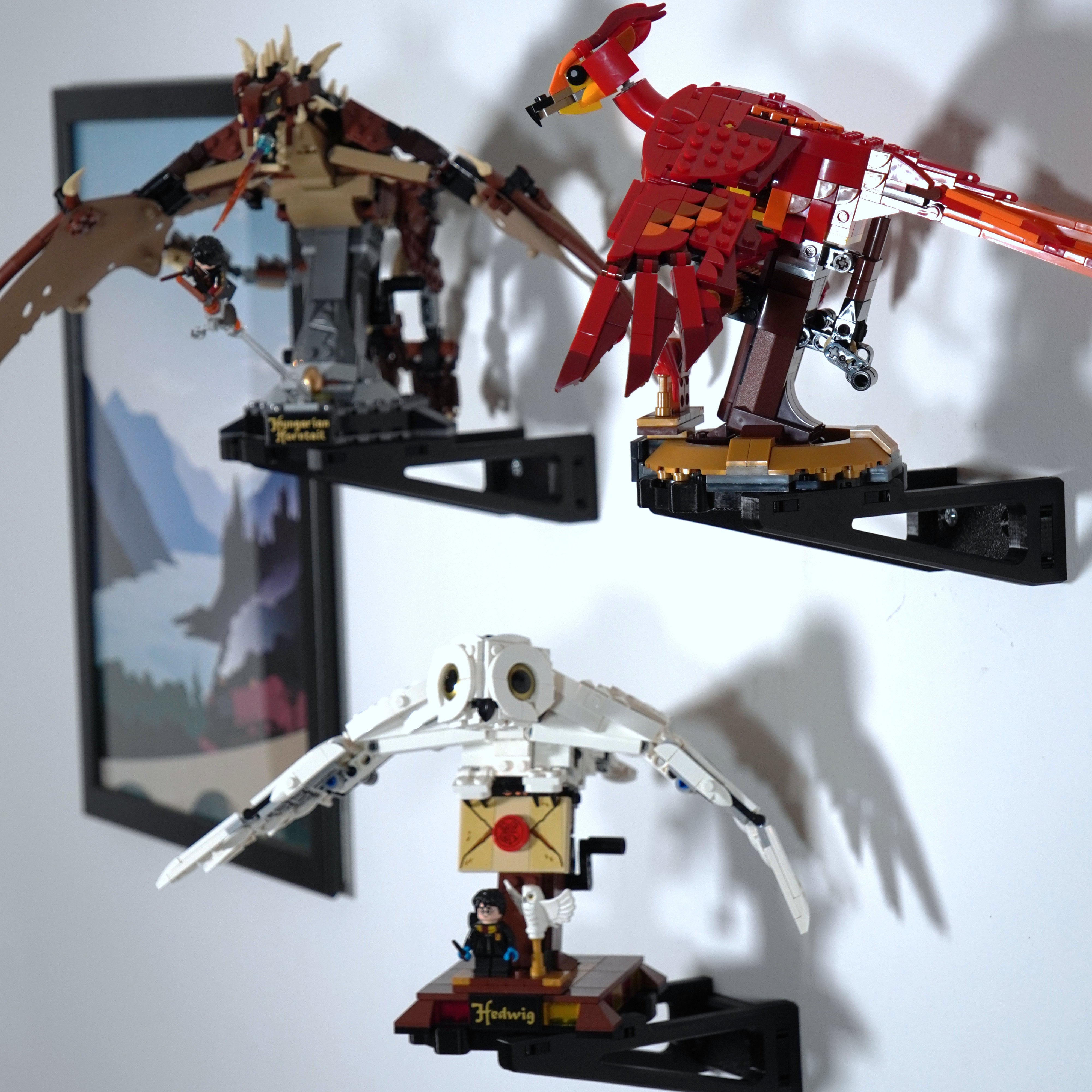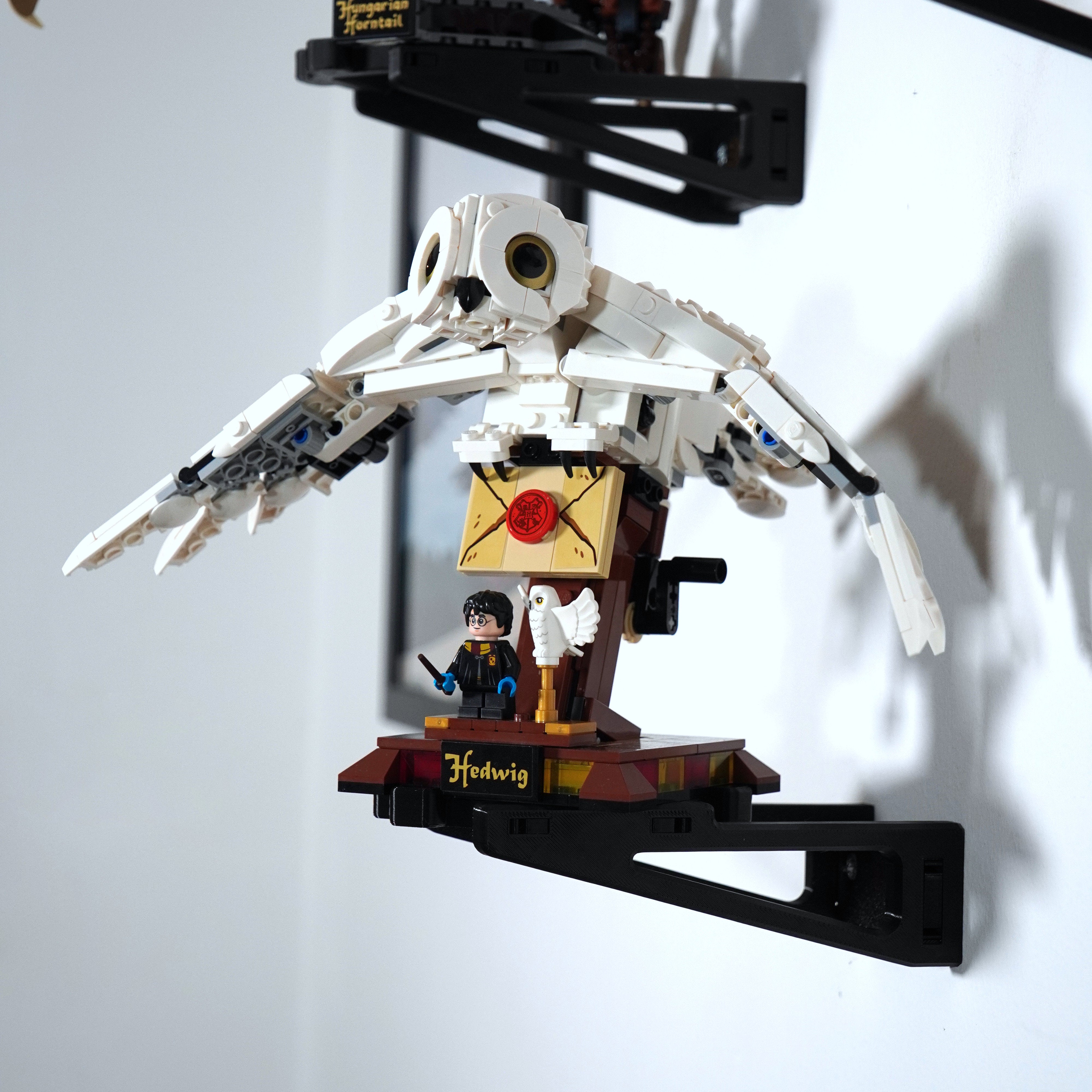 Få upp dina flygande LEGO Harry Potter-modeller på väggen med detta eleganta väggfäste. Det passar perfekt till Hedwig, Fawkes och den Ungerska Tagelsvanset och inkluderar plats för minifigurerna. Konstruktionen gör det enkelt att ta bort modellen igen, och själva fästet monteras säkert med två skruvar.
