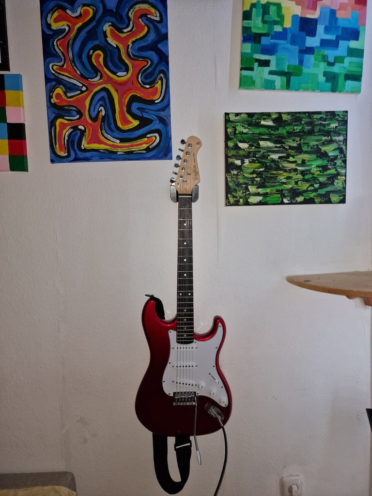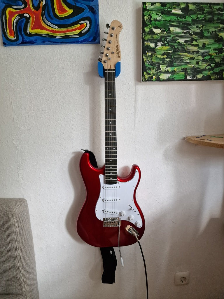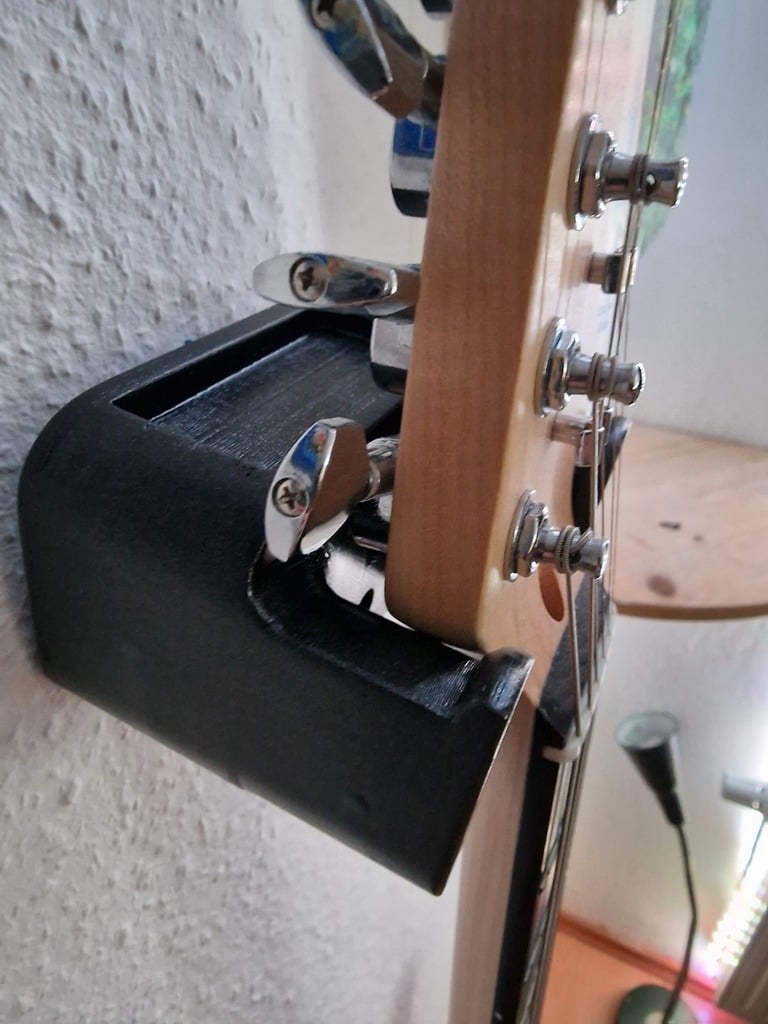 Denna gitarrhängare är utrustad med ytterligare ett tredje hål för skruvar och ett praktiskt utrymme för förvaring av hackor ovanpå. Genom den ursprungliga solida designen kan den enkelt och säkert bära din gitarr.