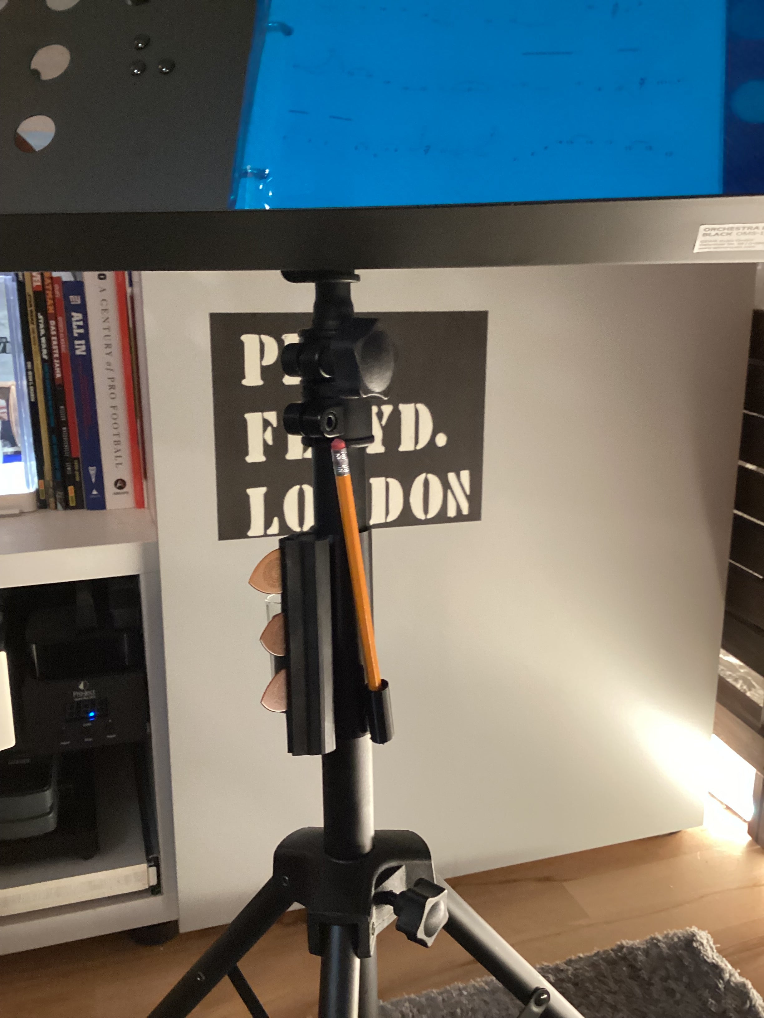Praktisk hållare för gitarrplektrum och slides för orkesterstativ