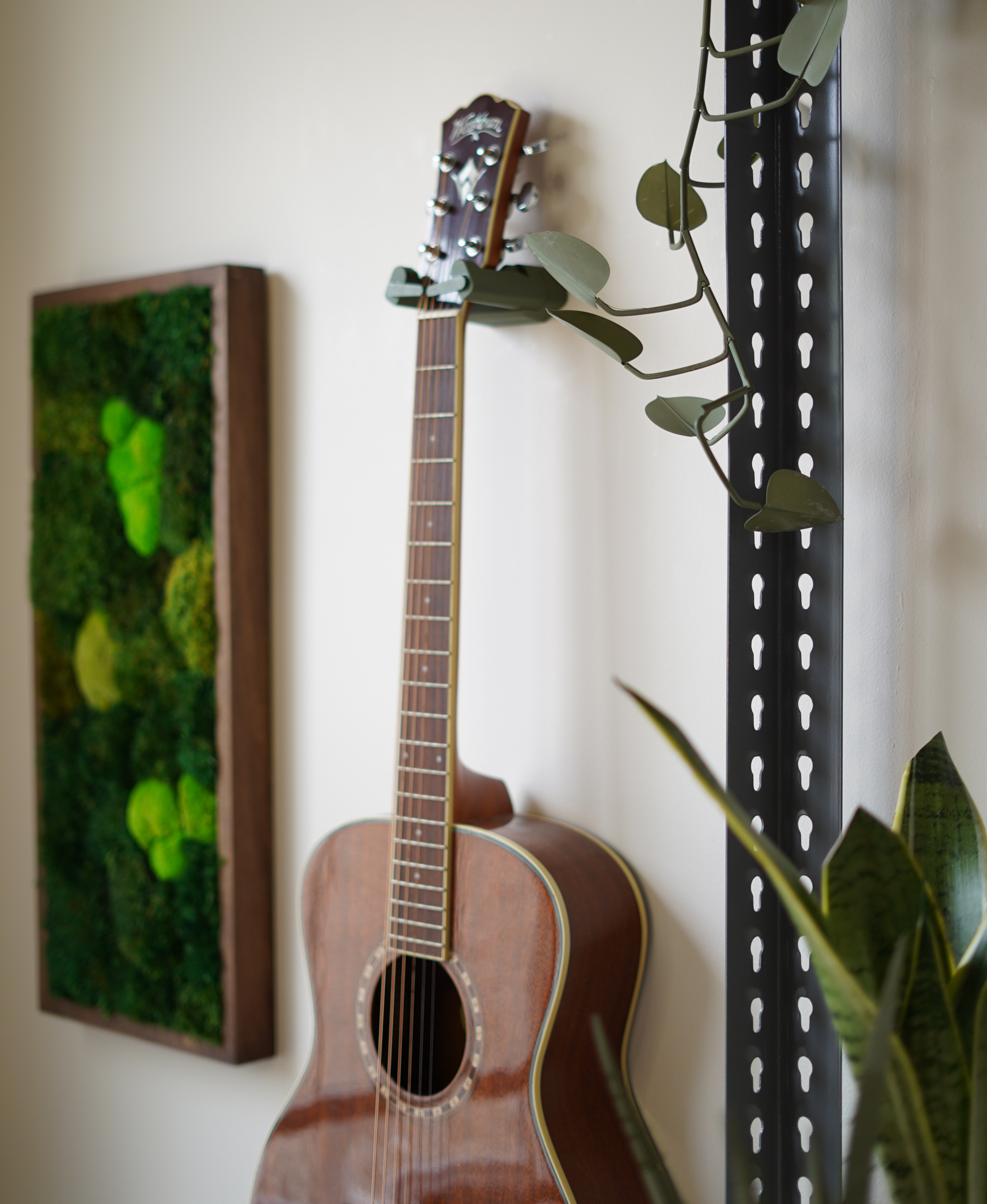 - Flexibel lösning som passar in i olika rum som väggmonterad gitarrhängare.