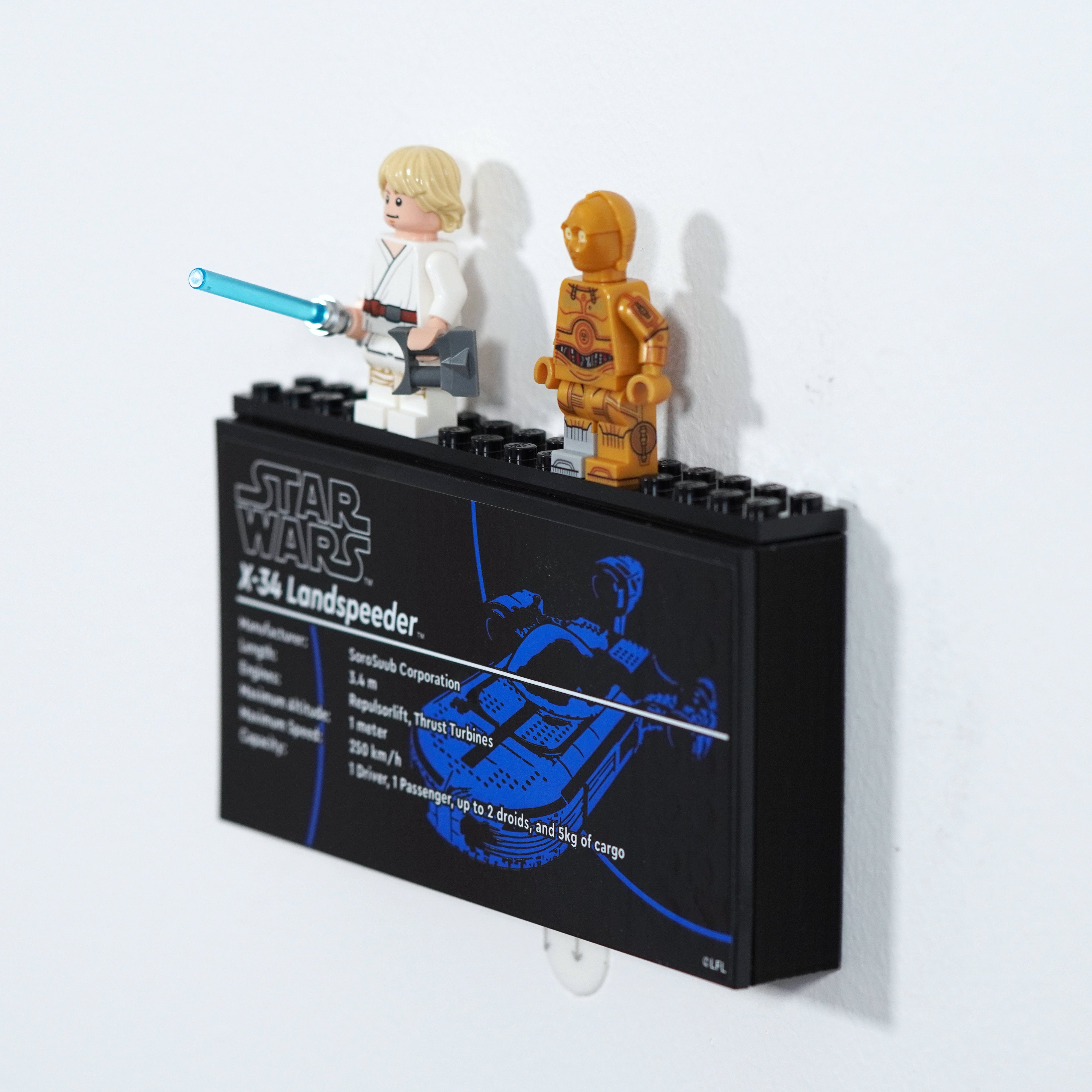 Detta väggfäste är specifikt utformat för Luke Skywalkers Landspeeder set 75341. Det gör det möjligt att presentera modellen vänd antingen åt vänster eller höger. Lösningen inkluderar hållare för informationsplattan och plats för minifigurerna, och monteringen kräver endast två vanliga väggskruvar.
