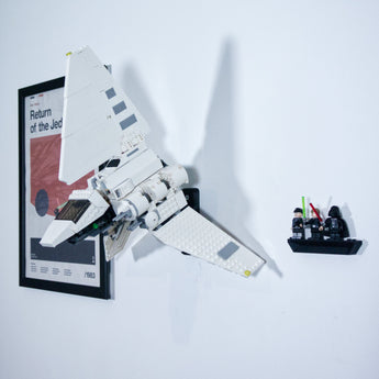 Detta väggfäste presenterar din Imperial Shuttle framåtvänd, vilket framhäver modellens vingform. Fästet erbjuder justerbar vinkel för optimal visning och gör det enkelt att ta bort setet vid behov. En separat hållare för minifigurer medföljer, så att hela samlingen kan visas upp tillsammans på väggen.