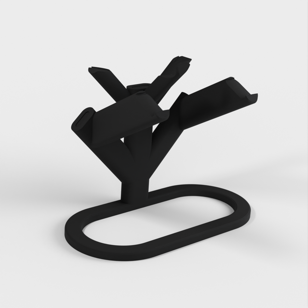 Stativ för Meta/Oculus Quest 2 VR-headset och kontroller där du sparar utrymme genom att orientera saker vertikalt i en trädkonfiguration. Det håller också kontrollerna i ett ergonomiskt läge så att de är redo att greppa.