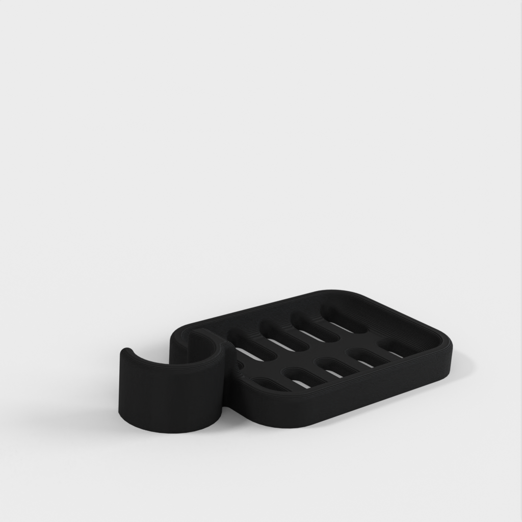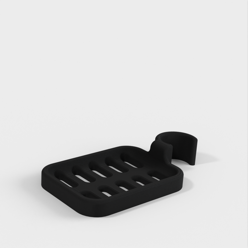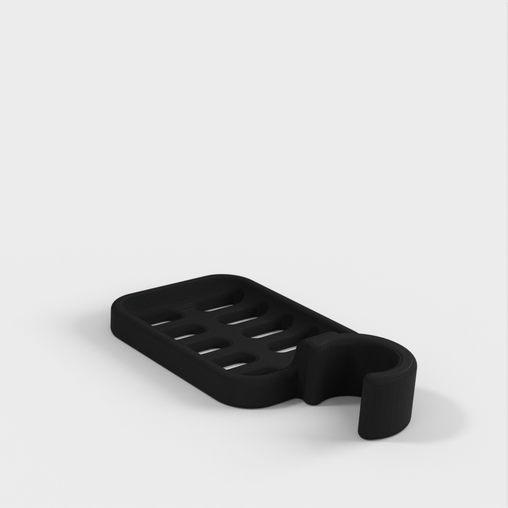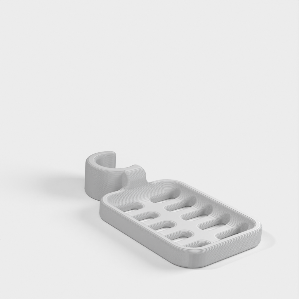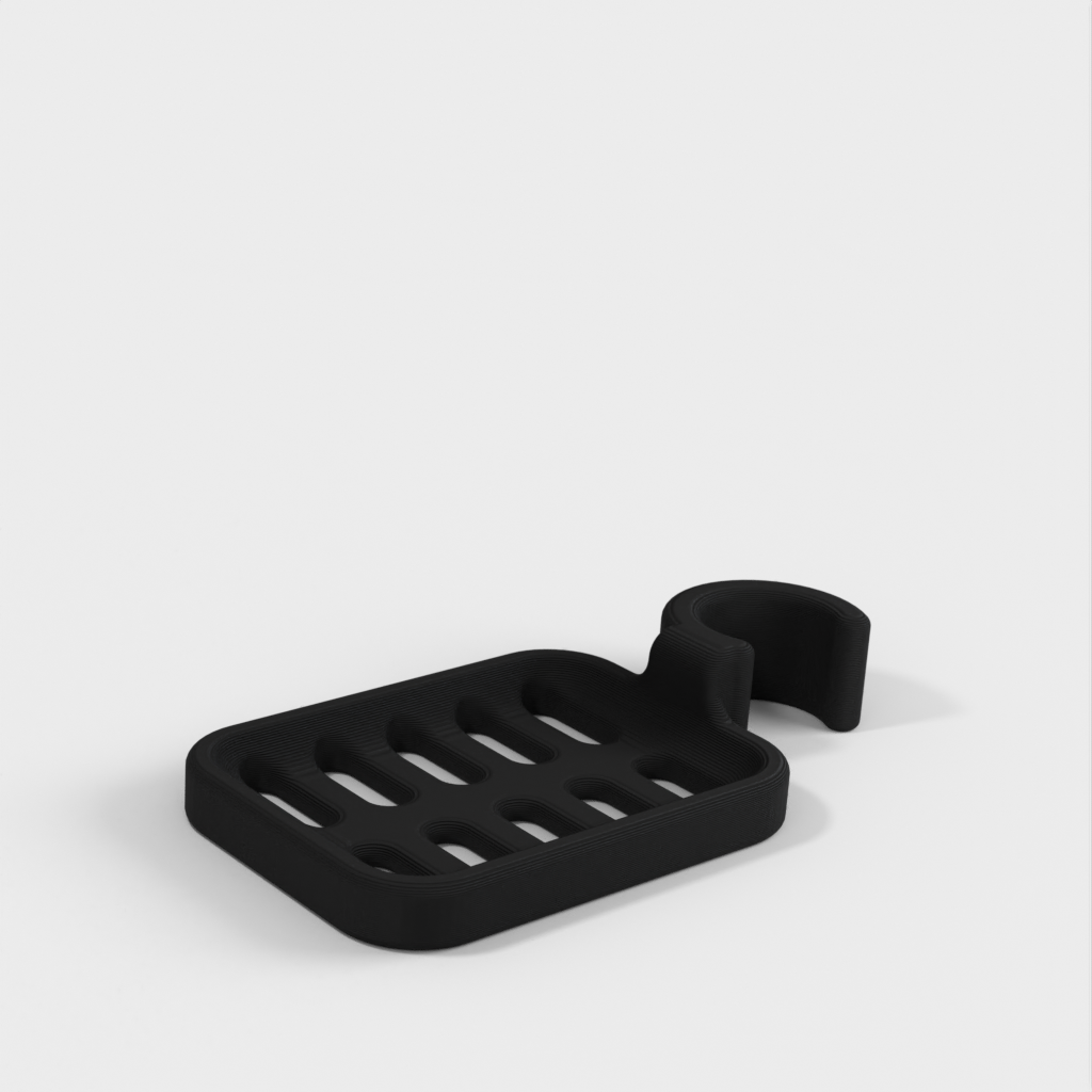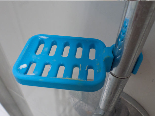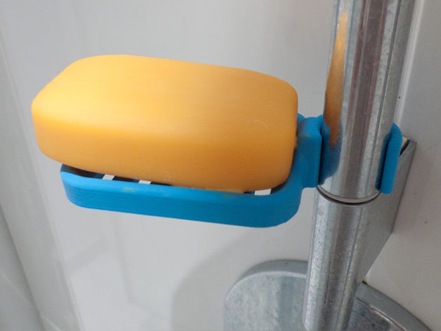 Duschtvålhållare utformad för att klämmas fast på duschstången. Tvålhållaren är speciellt designad för att passa en rund stång med en diameter på 21,9 mm. Kom ihåg att tvålhållaren är lite mindre i storleken. Det rekommenderas inte att använda PLA om möjligt eftersom kroken riskerar att gå sönder efter ett tag, speciellt i duschmiljö. ABS-plast rekommenderas som ett mer hållbart material för denna produkt.