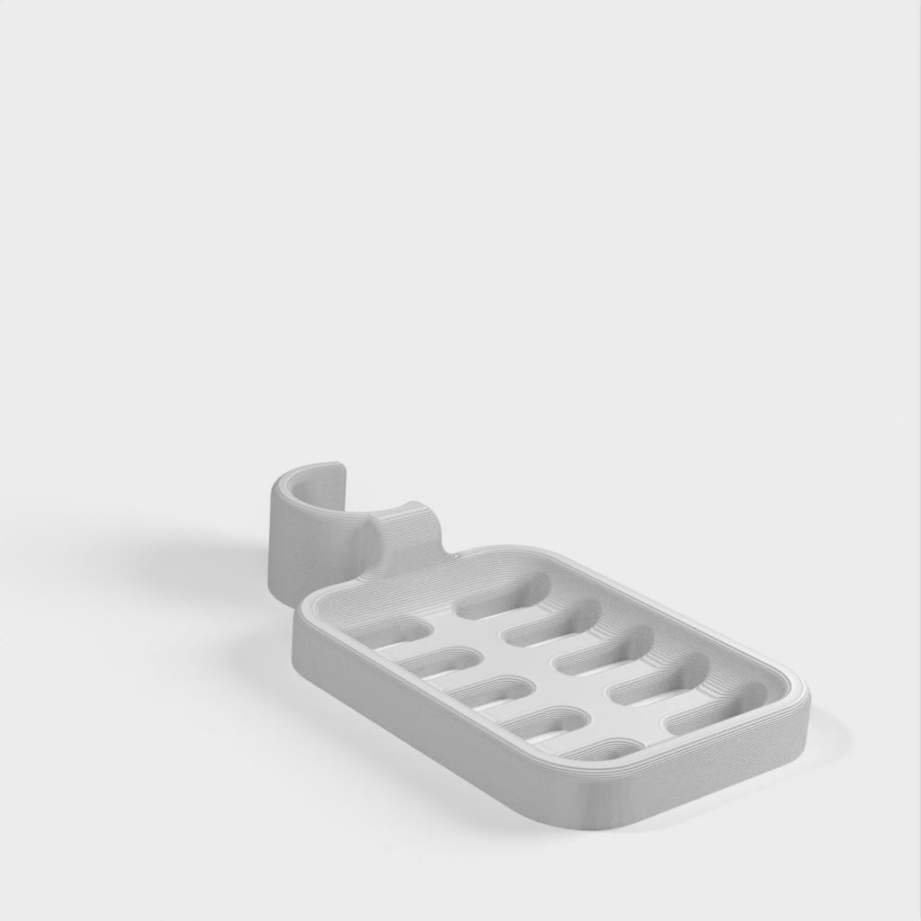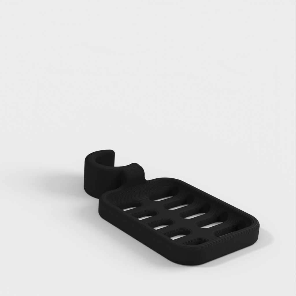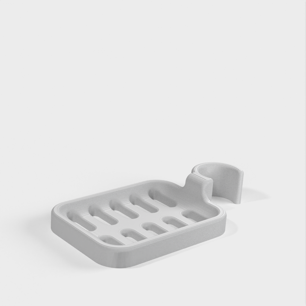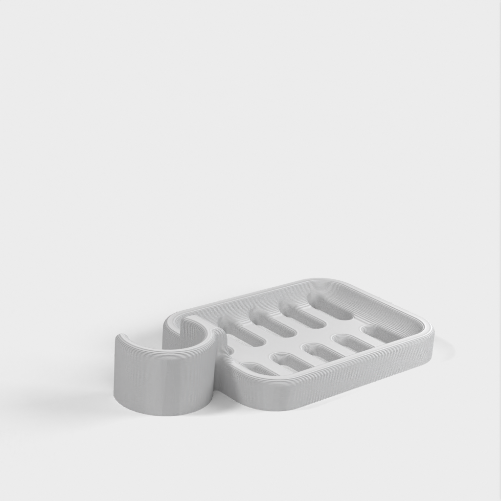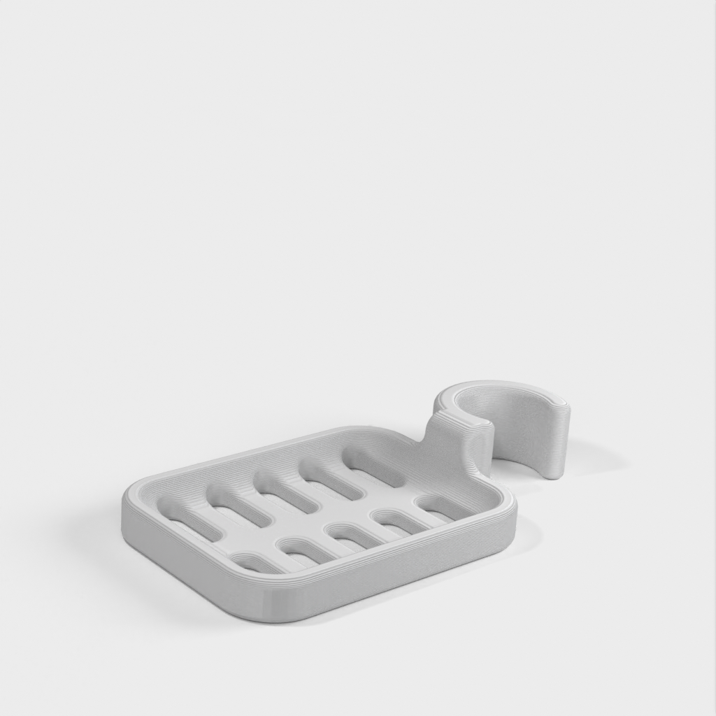 Duschtvålhållare utformad för att klämmas fast på duschstången. Tvålhållaren är speciellt designad för att passa en rund stång med en diameter på 21,9 mm. Kom ihåg att tvålhållaren är lite mindre i storleken. Det rekommenderas inte att använda PLA om möjligt eftersom kroken riskerar att gå sönder efter ett tag, speciellt i duschmiljö. ABS-plast rekommenderas som ett mer hållbart material för denna produkt.