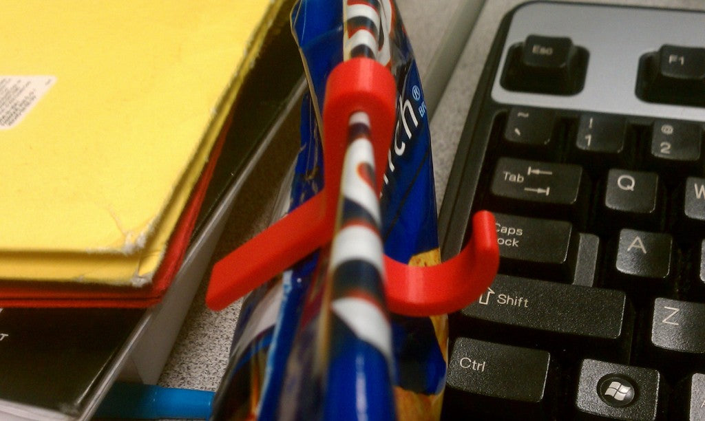 Enkel påsklämma designad för att enkelt stänga öppna påsar av olika slag. Det är bara nödvändigt att vika toppen av påsen några gånger och sedan placera klämman över den vikta kanten. Denna enkla men effektiva lilla pryl är lämplig att använda i köket, och för hemmet i allmänhet, för att hålla innehåll som bröd och chips fräscht.