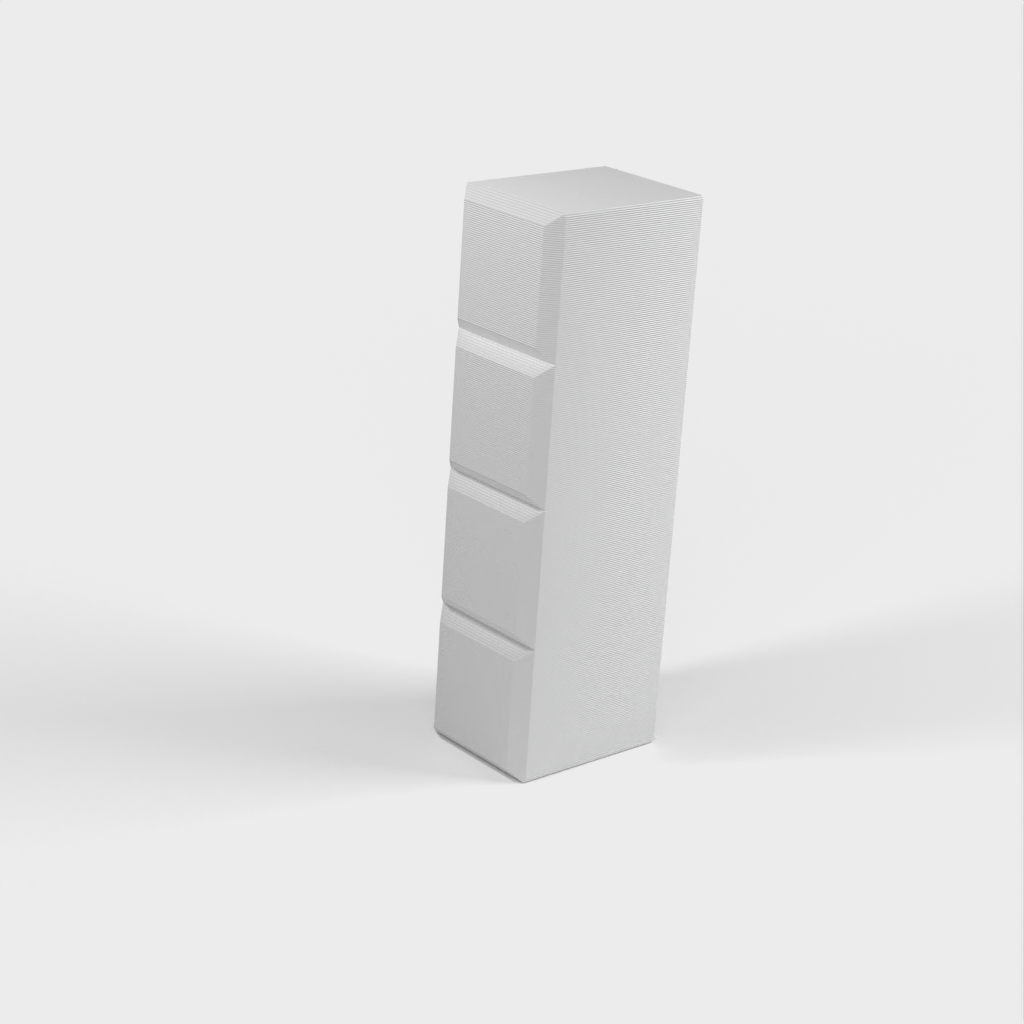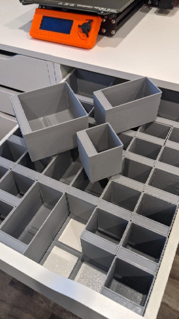 Ett enkelt modulärt containersystem för dina Ikea Alex lådor! Behållare kan anpassas till valfri storlek för att passa dina behov. Behållarna sitter i ett rutsystem längst ner på dina lådor för att förhindra förskjutning och hålla inriktningen. Handtag med etiketttejpfördjupningar för att hålla allt organiserat.