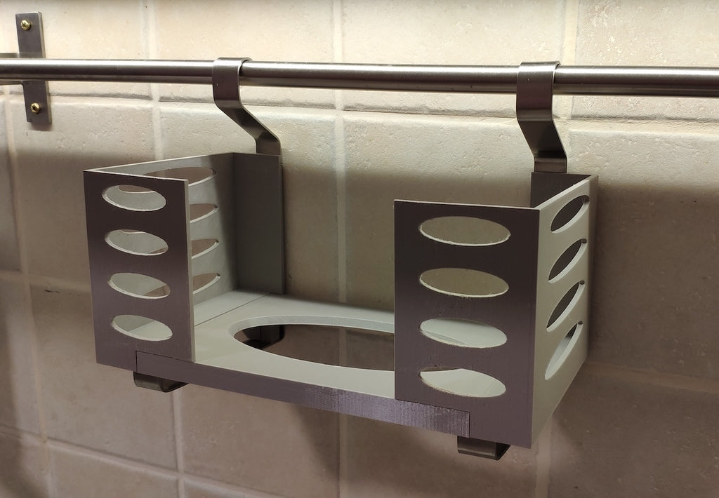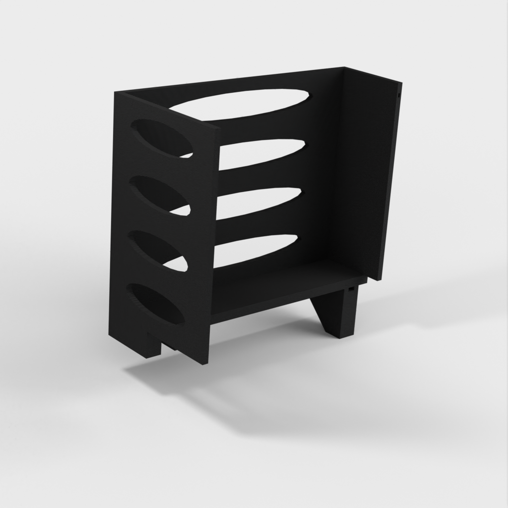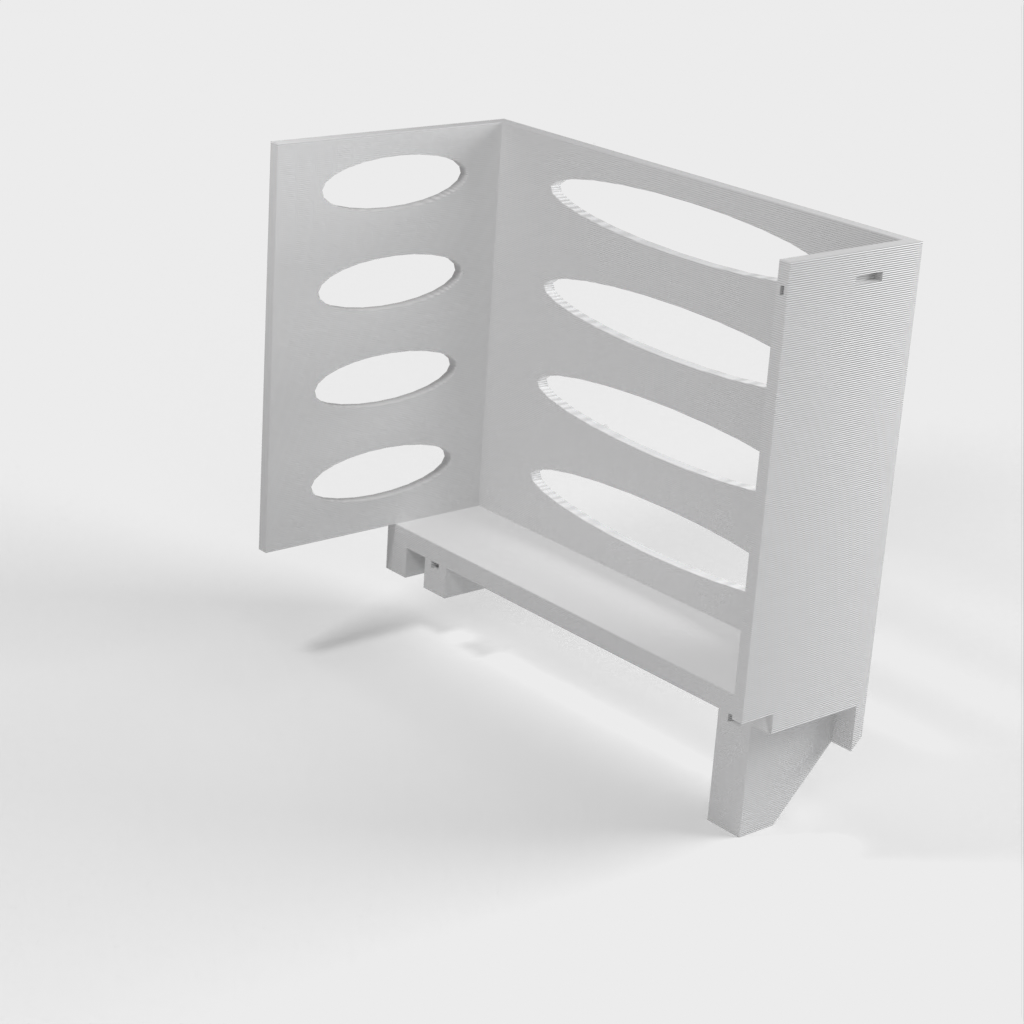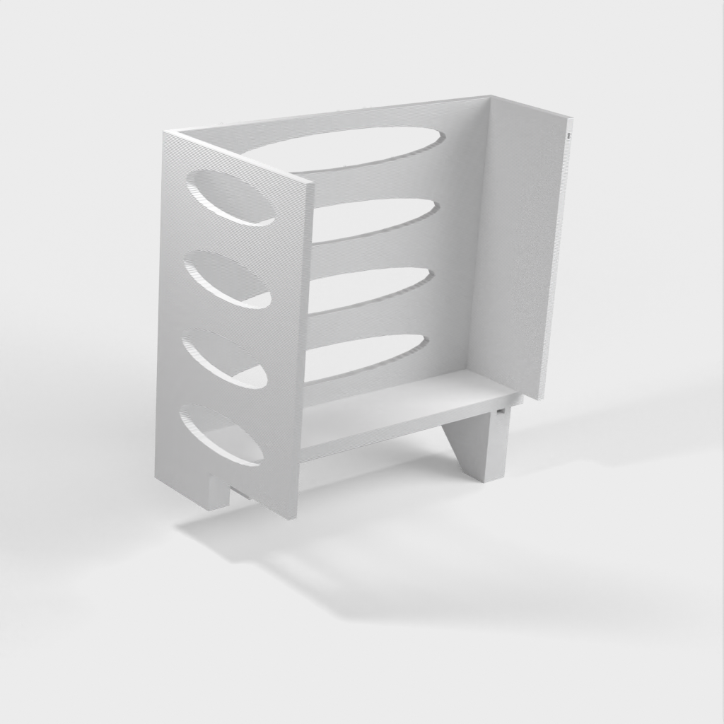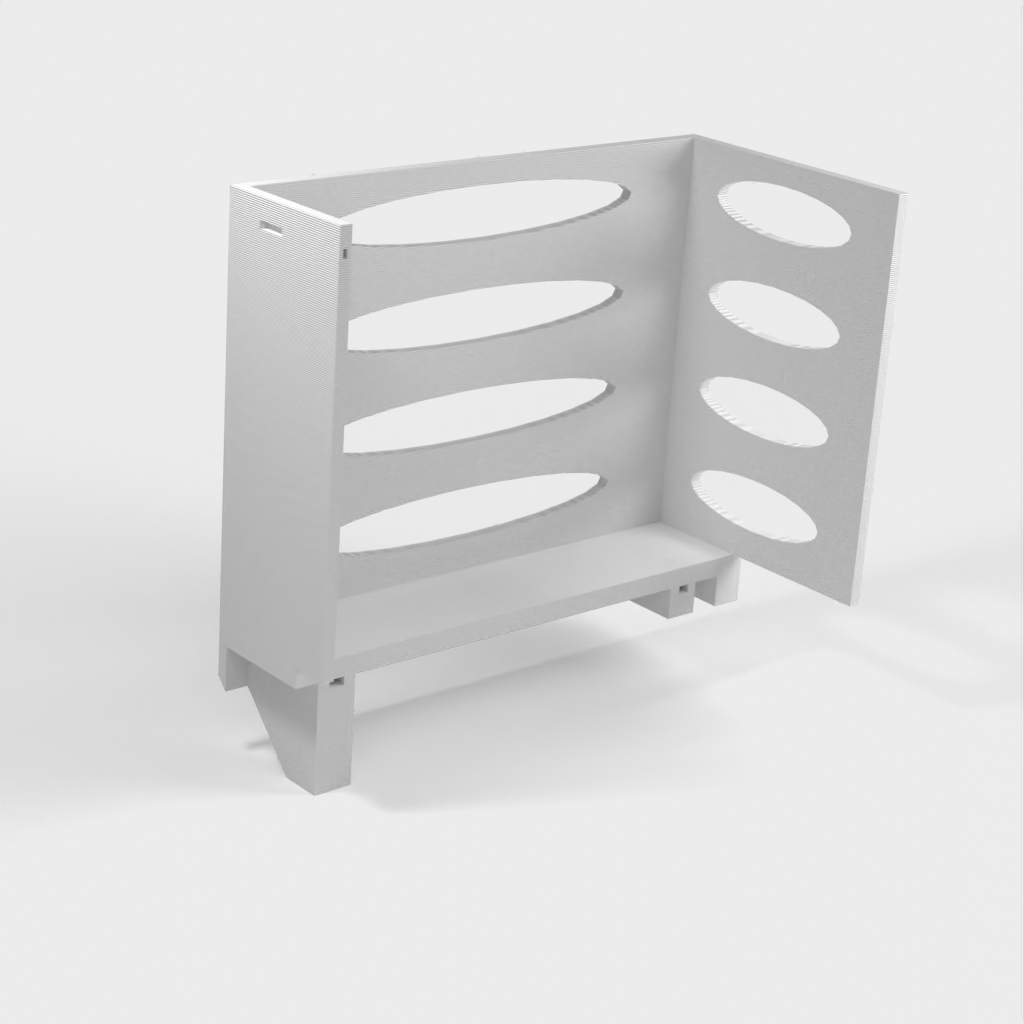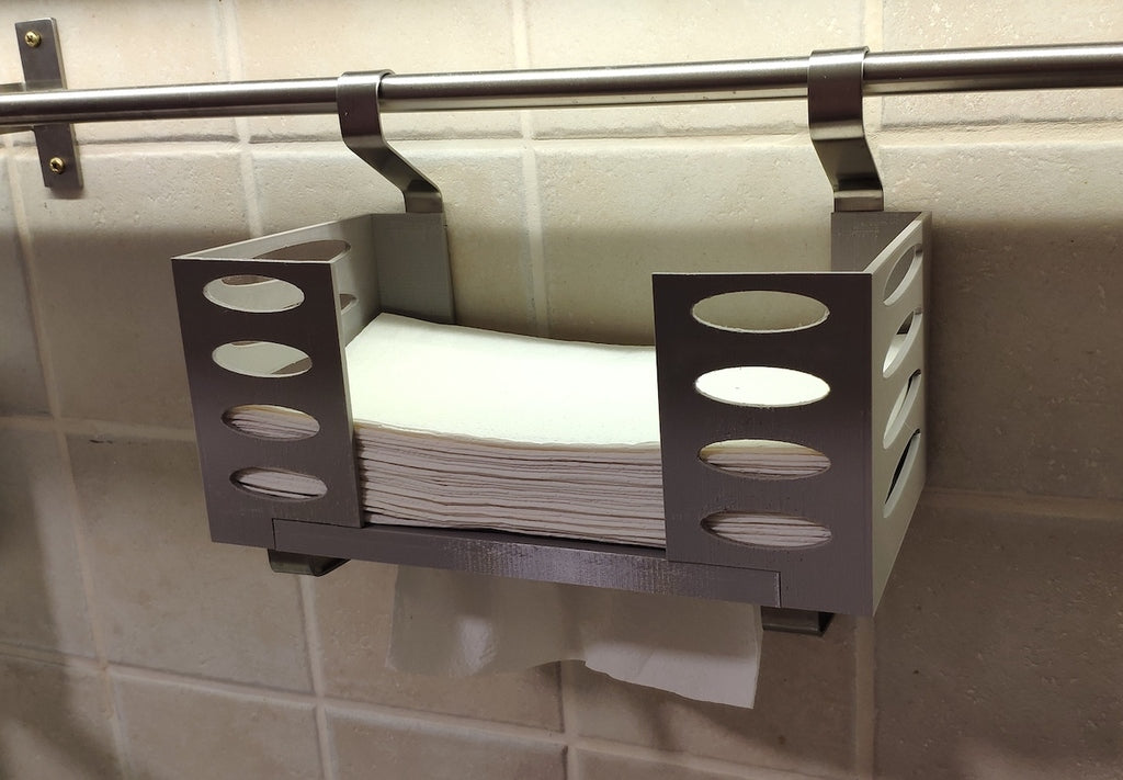 Denna pappershandduksdispenser kan monteras på ett Ikea Grundtal hyllfäste. Ta bara bort facket och placera de utskrivna föremålen på konsolerna. Produkten har mindre öppningar i botten som kan användas för att fästa ihop föremålen med en tunn tråd. Det finns även öppningar på baksidan för montering. Innermåtten är 130x254 mm.
