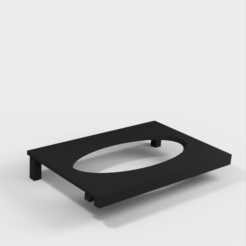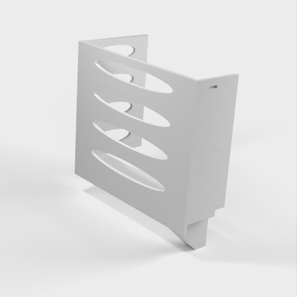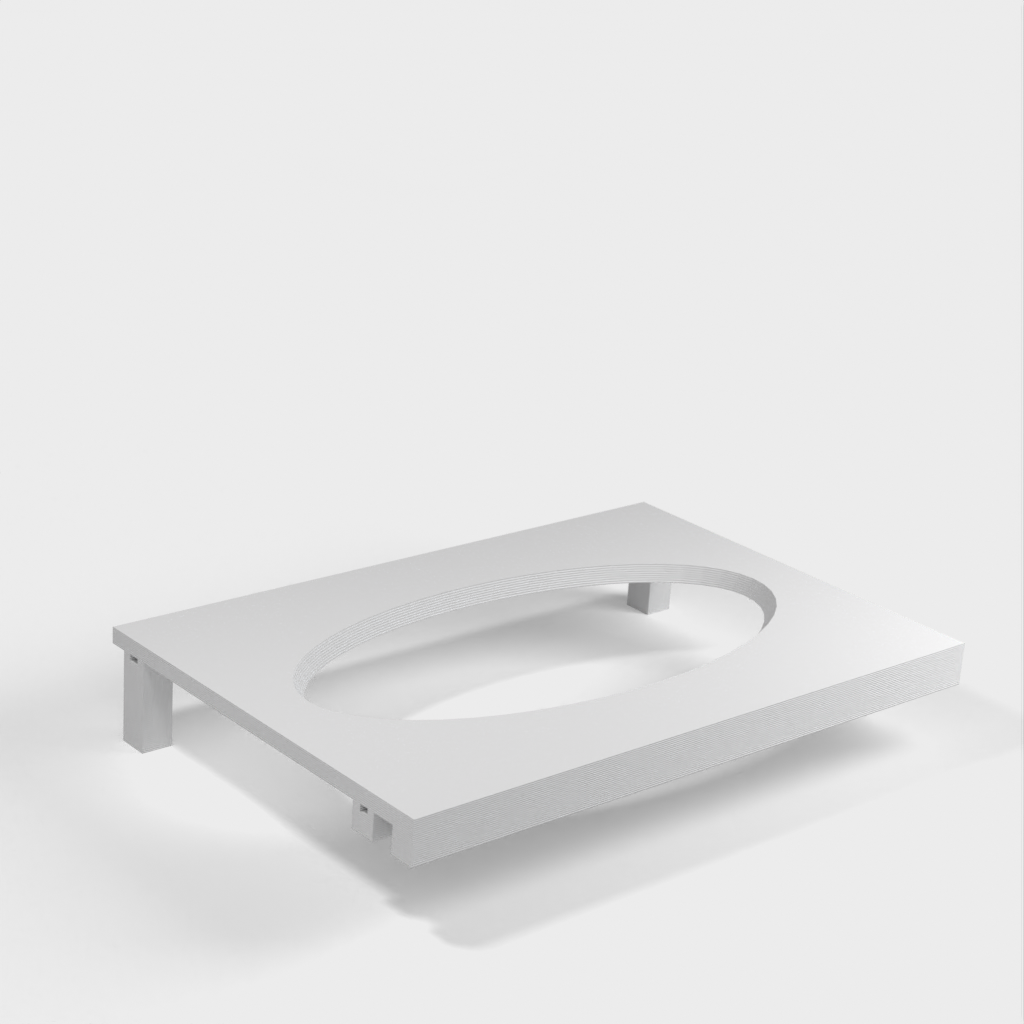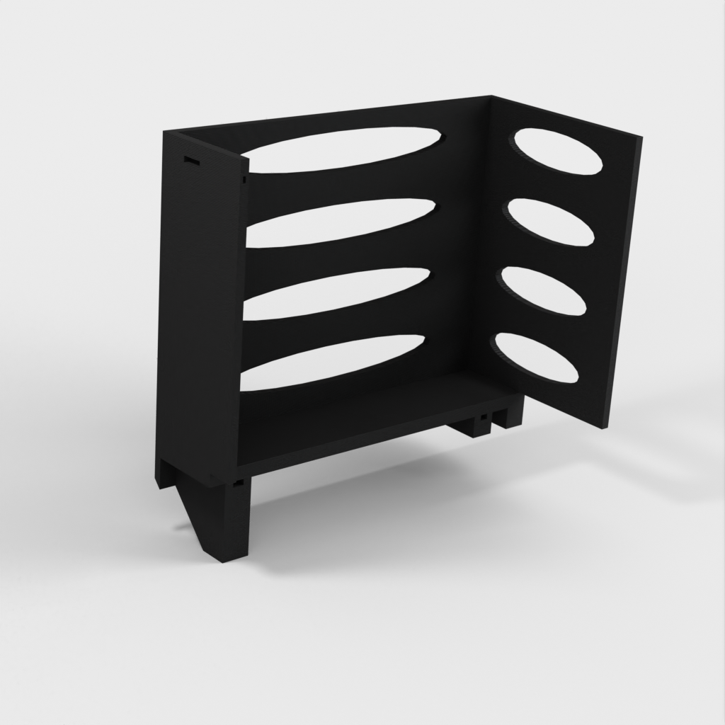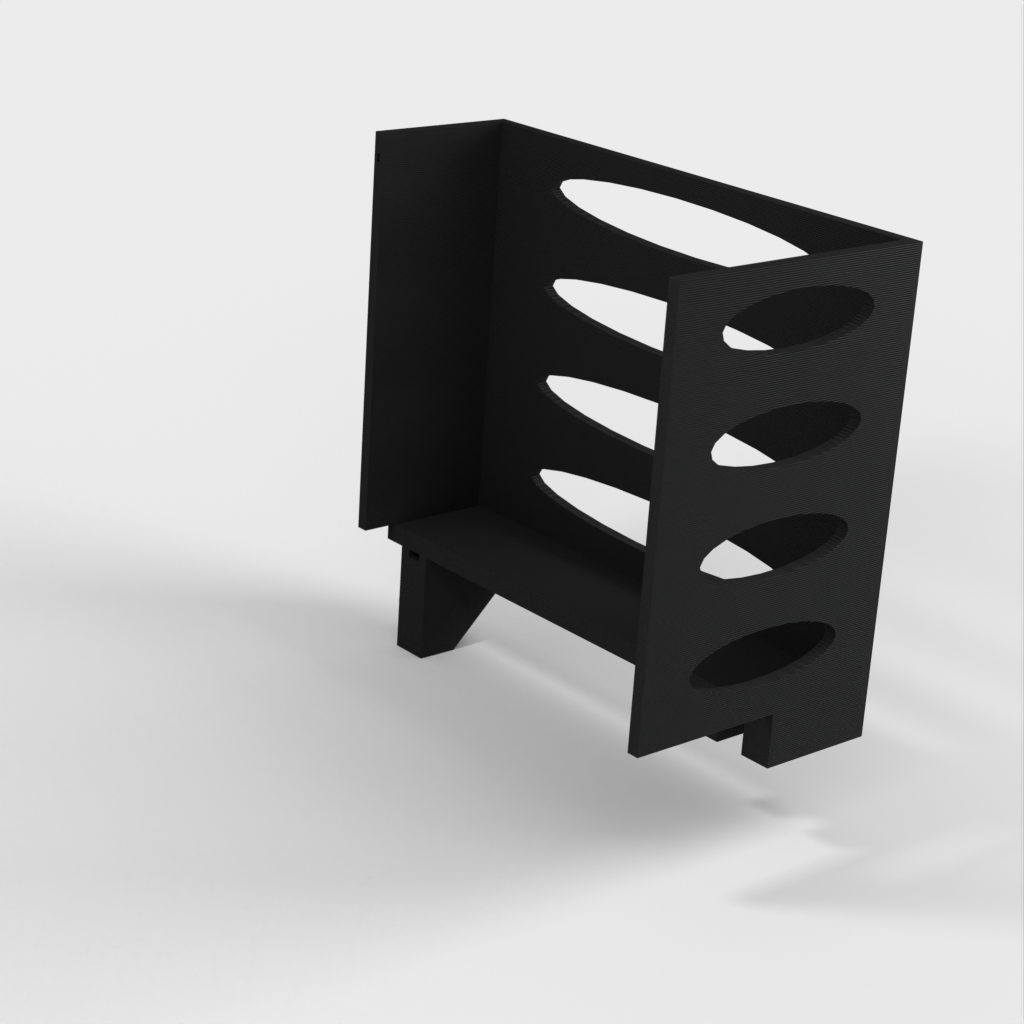 Denna pappershandduksdispenser kan monteras på ett Ikea Grundtal hyllfäste. Ta bara bort facket och placera de utskrivna föremålen på konsolerna. Produkten har mindre öppningar i botten som kan användas för att fästa ihop föremålen med en tunn tråd. Det finns även öppningar på baksidan för montering. Innermåtten är 130x254 mm.