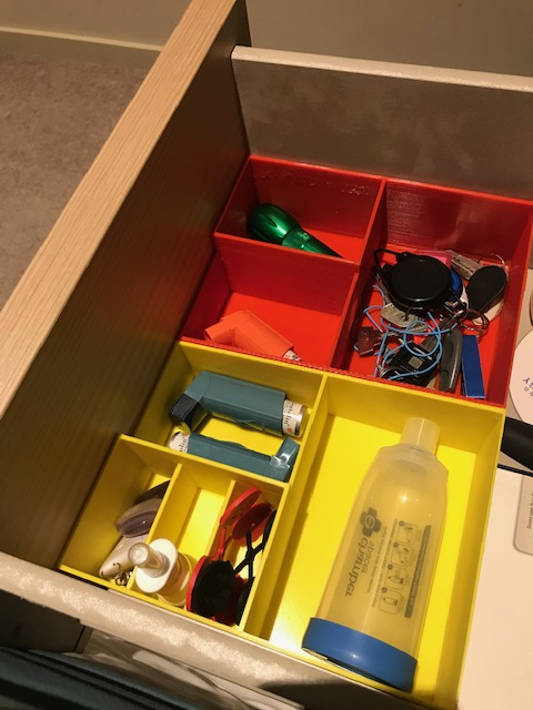 Var och en är gjord för att passa i 1/4-delen av Ikea 'MALM' nattduksbord, så skriv gärna ut 1, 2, 3 eller 4 av dem vardera. sänglåda. Själv har jag bara skrivit ut en till vänster och höger för att sitta längst fram i lådan, och en för baksidan, men man kunde orientera dem hur man vill.