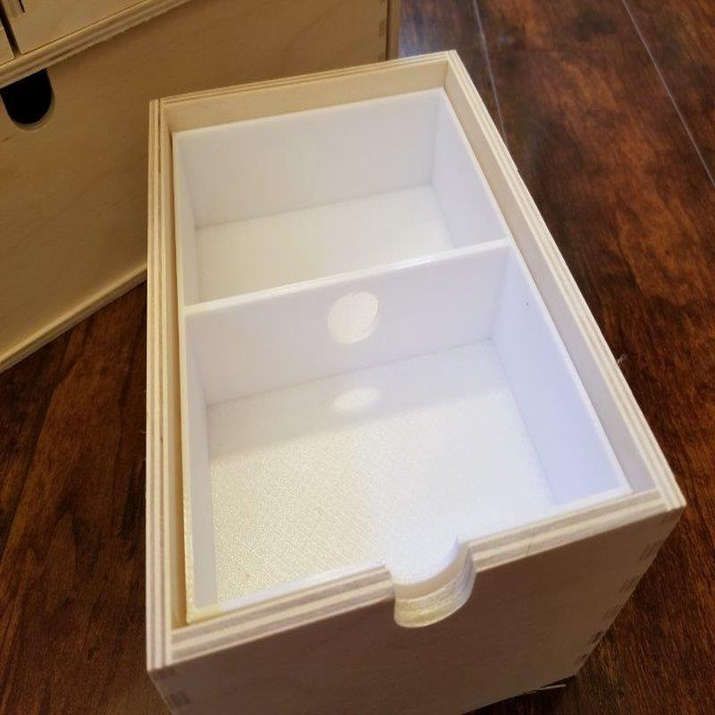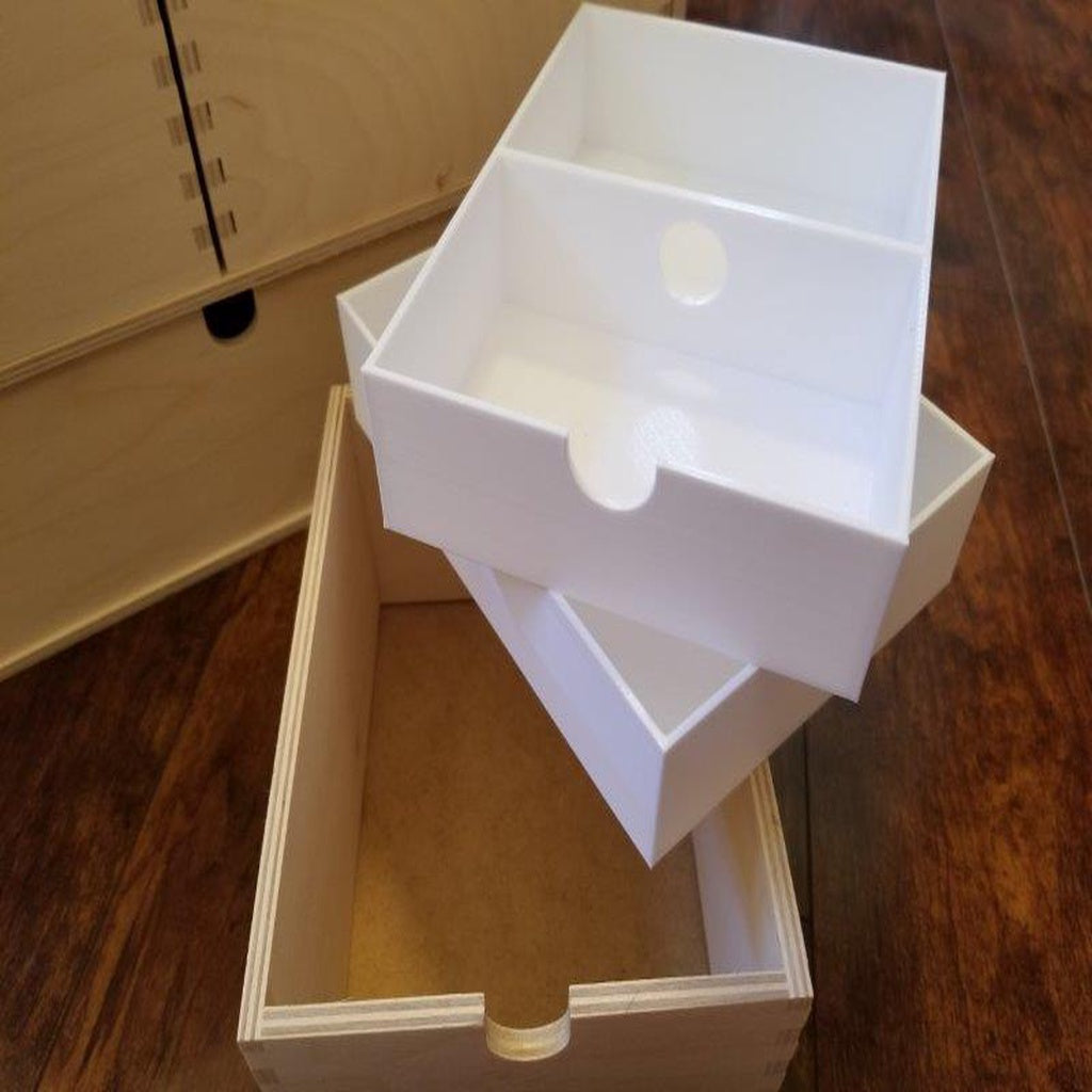 Det här är insatsupplägg för Ikea MOPPE lådor. Dessa passar i de mindre lådorna hos Moppe-arrangören. Botten och toppen är identiska, förutom toppen som har en skåra för drag i lådan.