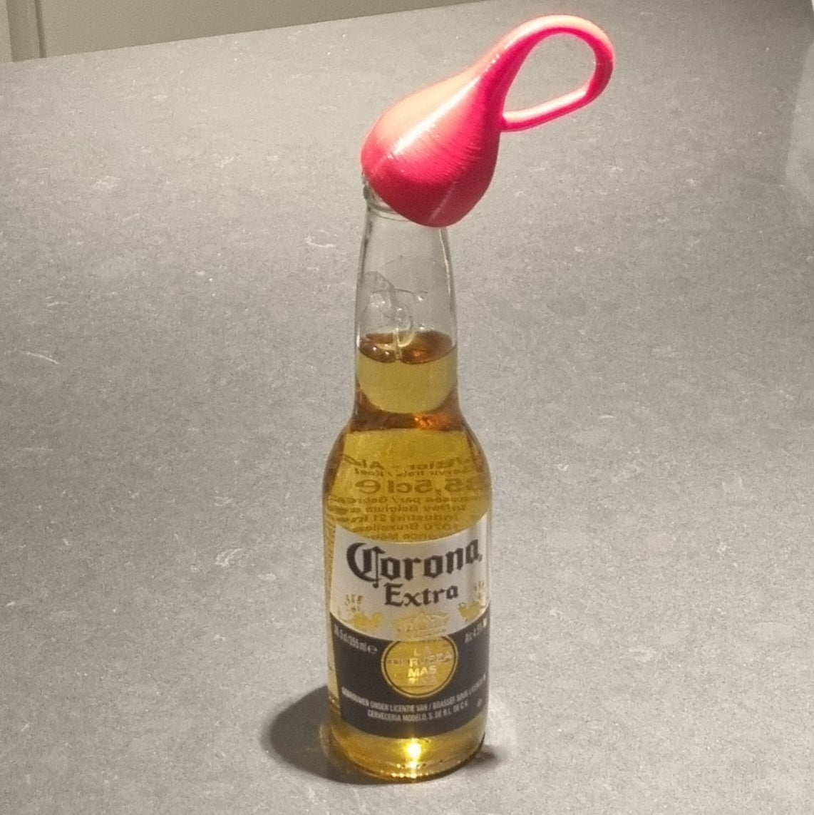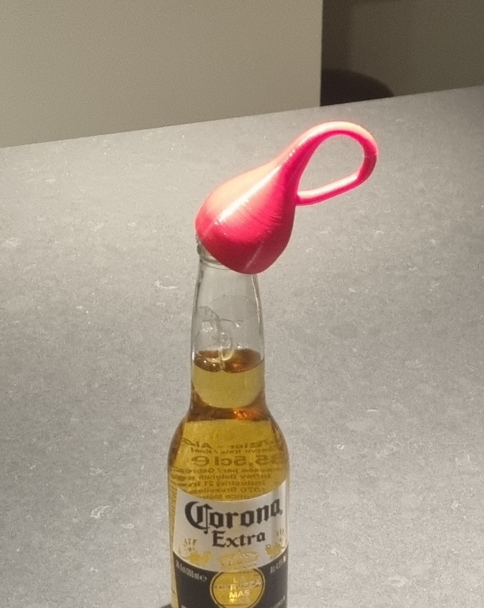 En flasköppnare i form av en Klein-flaska, ett 4-dimensionellt föremål som inte har någon skillnad mellan insida och utsida. Obs, kanske detta tryck bara kan öppna vanliga flaskor, tyvärr inte Klein-flaskor.