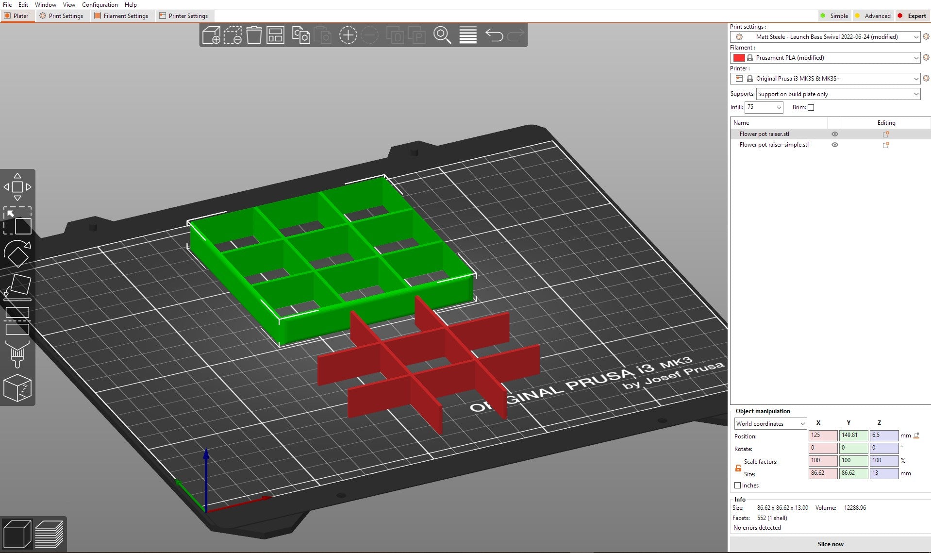 Krukförhöjaren är en enkel variant utan den vanliga bården, men fungerar lika effektivt. Med denna produkt kan du enkelt justera X-, Y- och Z-måtten för att passa din trädbehållare och bestämma hur högt du vill höja din kruka. Det finns inga bärande strukturer, använd 4 eller 5 omkretsar för att undvika utfyllnadsljud. Lagerhöjd på 0,2 mm eller mer - ingen kommer att se det i blomkrukbehållaren.