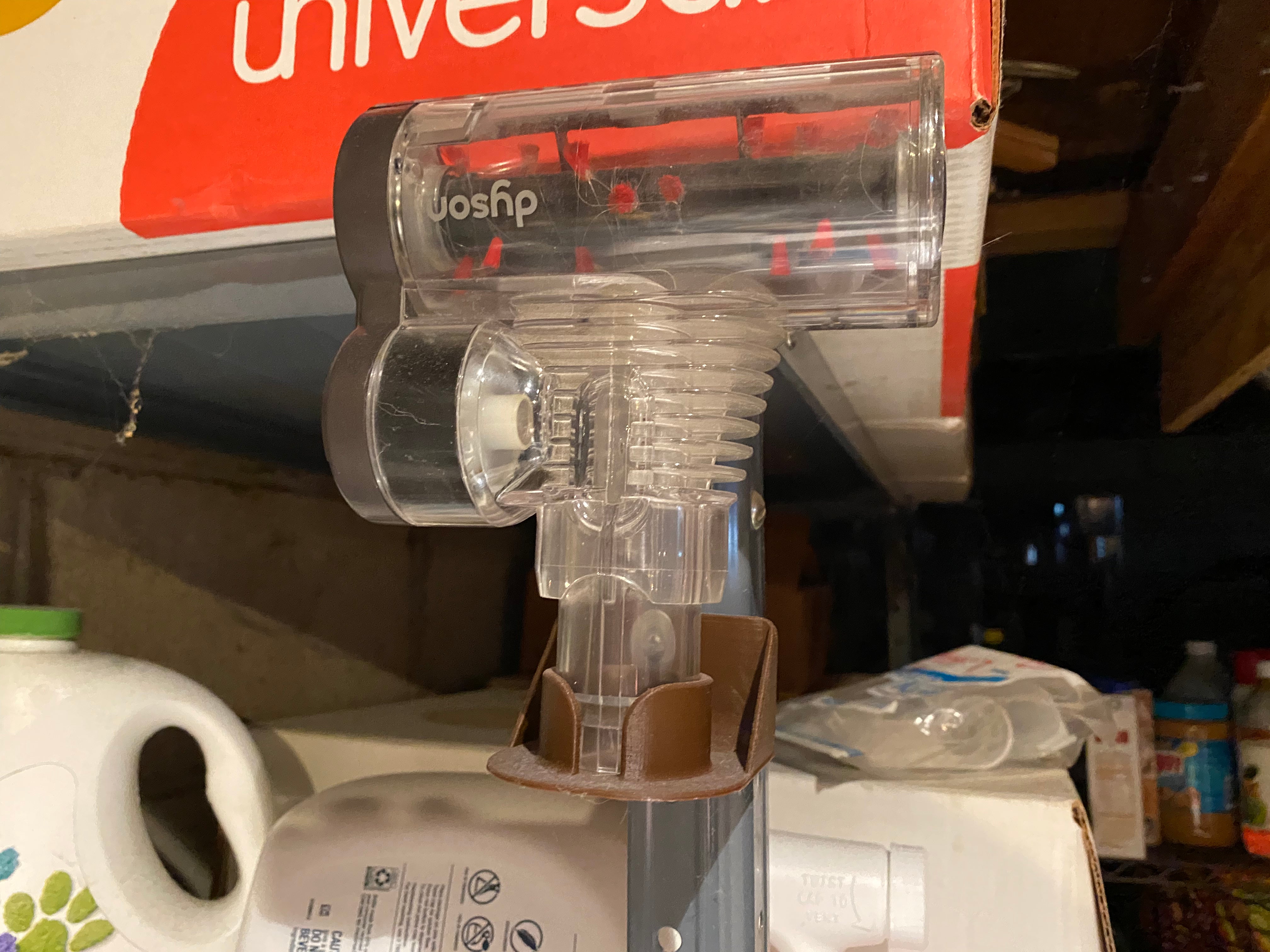 Detta är en väggmonterad hållare för ett enda Dyson vakuumverktyg. Jag köpte vakuumtillbehöret som följer med Dyson Animal, men dammsugaren hade ingen förvaring ombord för det, och jag använder det inte så ofta, så jag förvarar det i källaren.