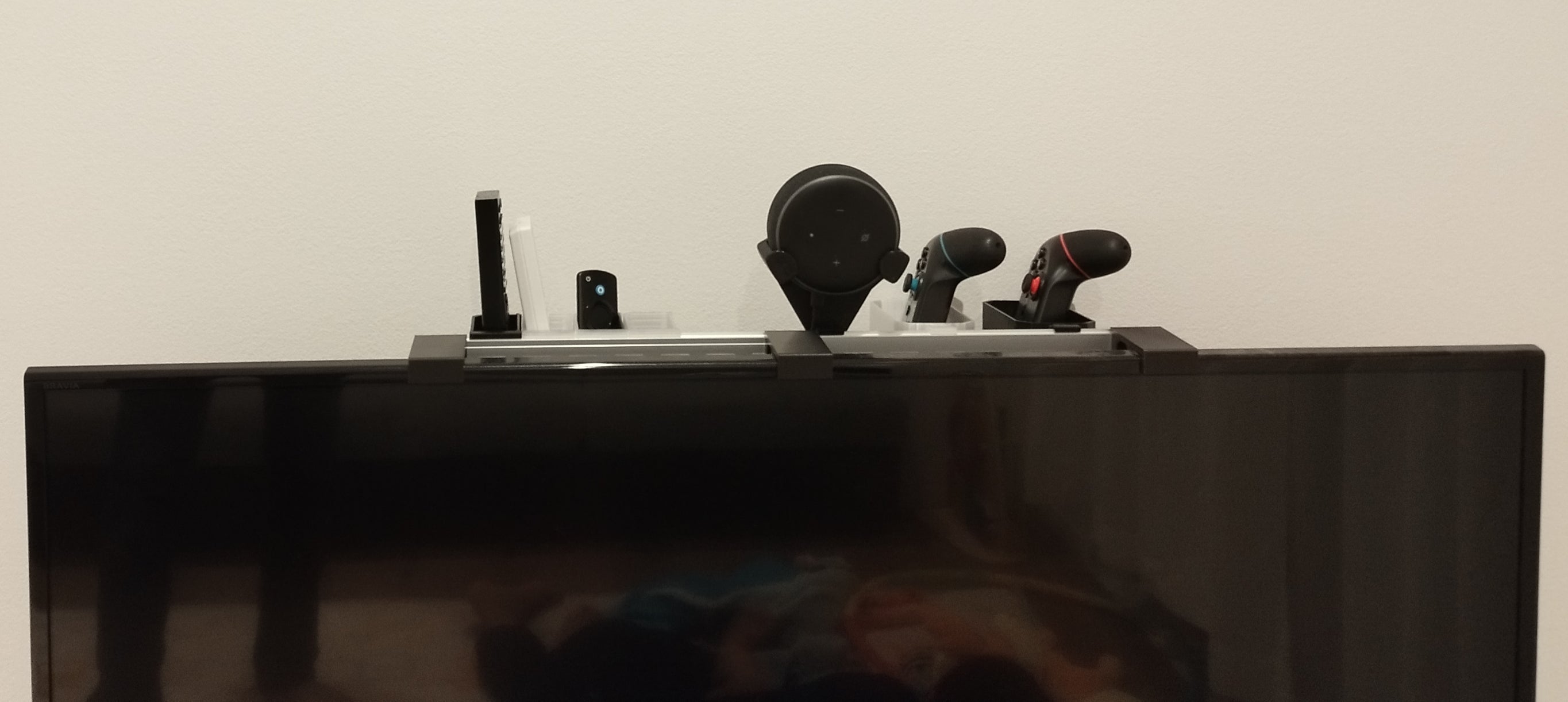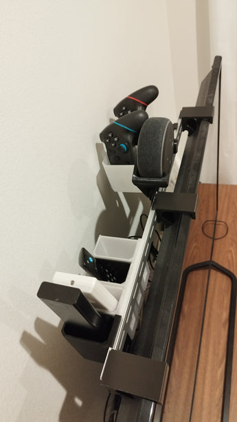 Hållaren är baserad på ett flexibelt DIN-skenesystem, vilket gör att du kan anpassa förvaringen exakt efter dina behov. Du kan enkelt montera olika hållartyper på skenan för att rymma allt från din TV-fjärrkontroll, AC-fjärrkontroll och Fire TV-fjärrkontroll till en Amazon Echo Dot (3:e generationen) eller till och med en Switch Pro Controller. Den modulära designen gör att du kan utöka skenan med flera sektioner om du behöver ytterligare förvaringsutrymme. Observera att TV:n måste kunna bära den extra vikten.