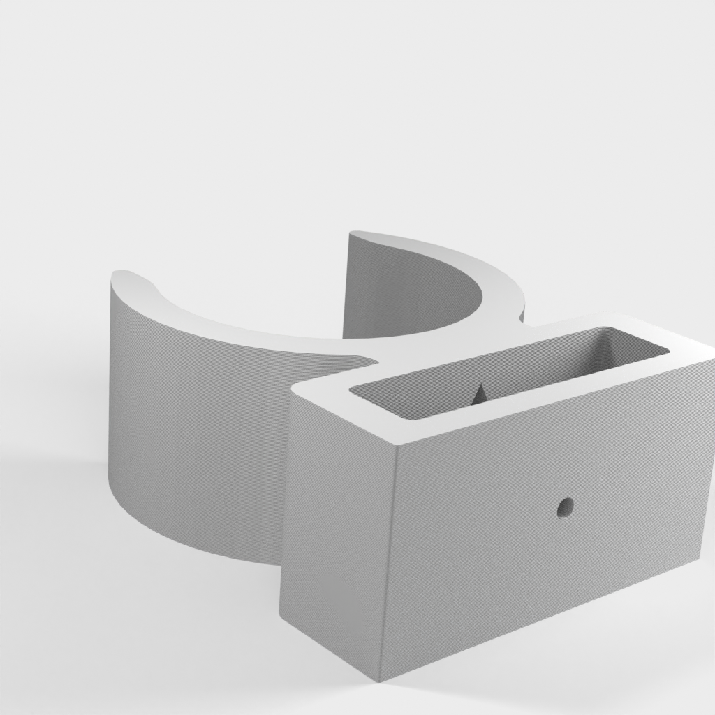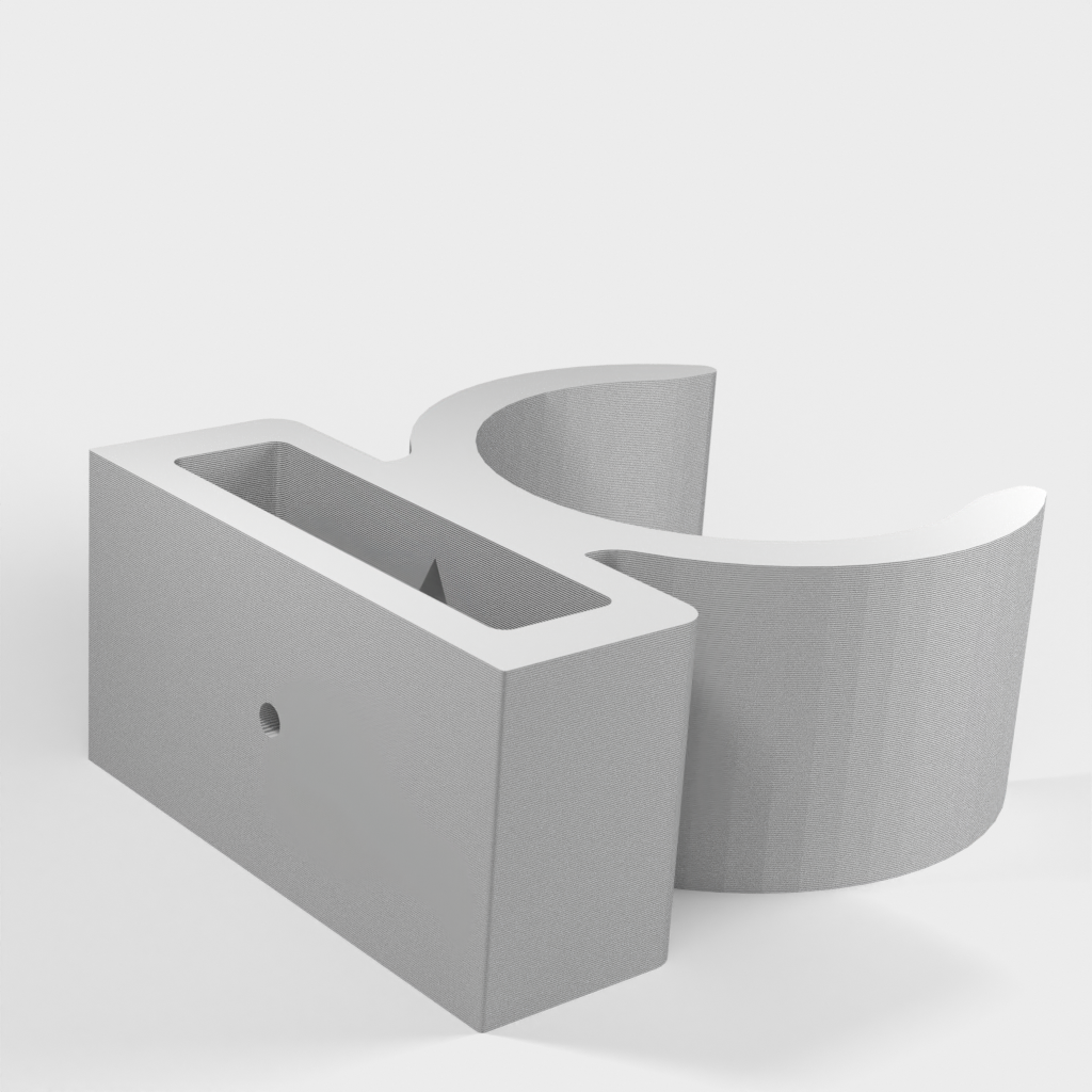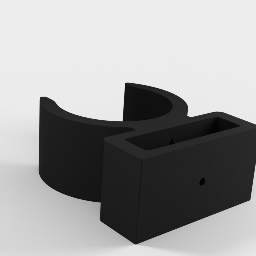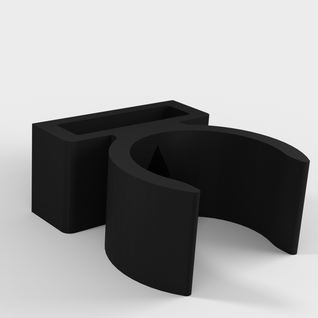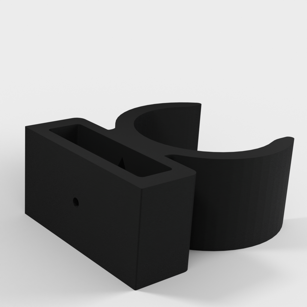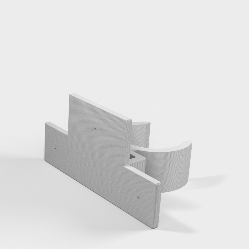 Hållare för ETA Stellar dammsugarrör. Den nedre delen stöder T-formade delar av röret och rekommenderas att fästas med skruvar, eftersom den bär större delen av vikten. Den övre delen är avsedd för rör med en diameter på 32 mm, men den kan även användas för delar med en diameter på 35 mm utan problem. Denna del kan fästas antingen med skruvar eller dubbelhäftande tejp.