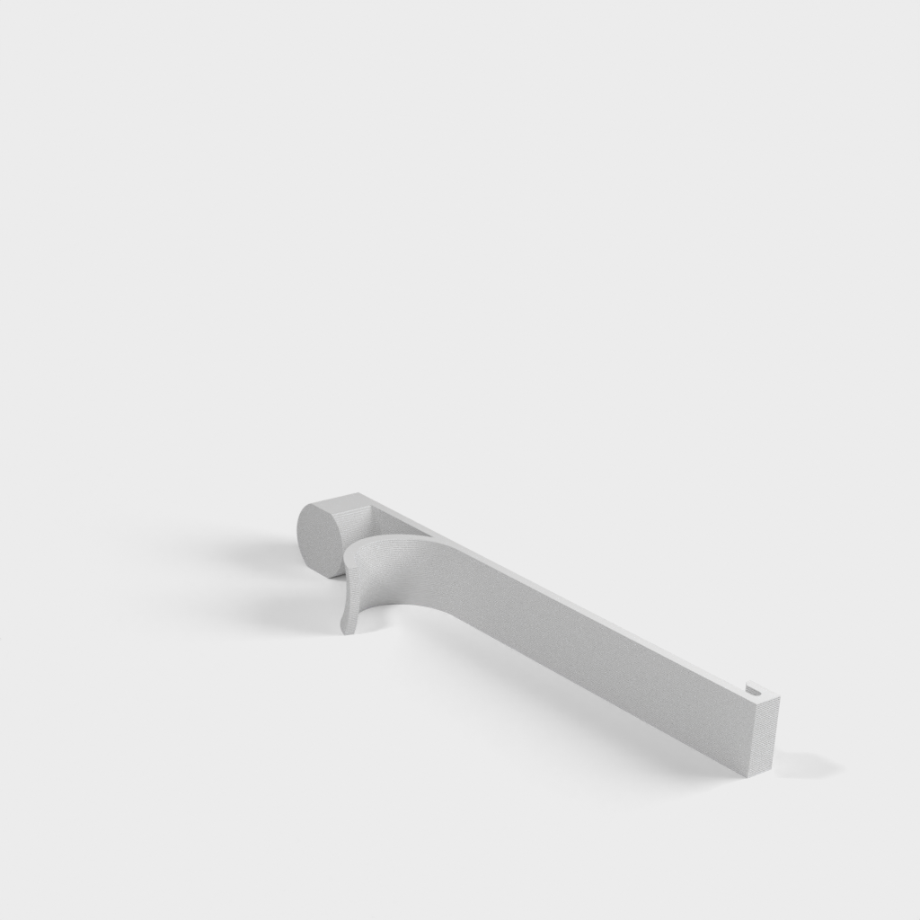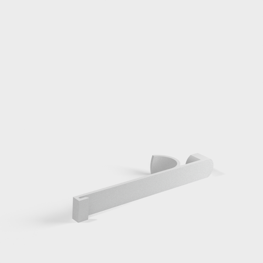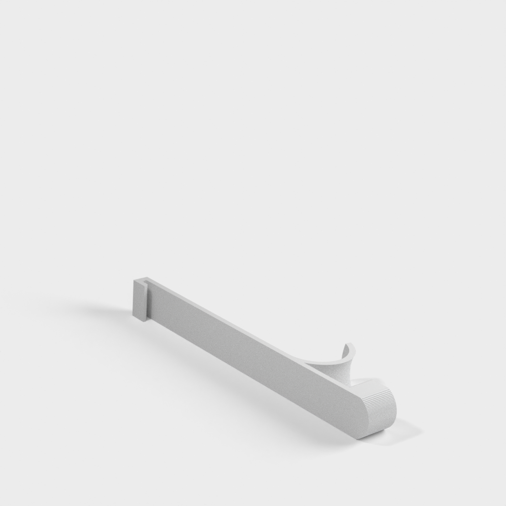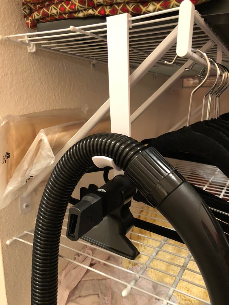 Vägghållare för en vanlig dammsugarslang. Den kan enkelt hängas på en 3 mm trådskåpshylla. Har även extra förvaringsutrymme för dammsugarens tillbehör.