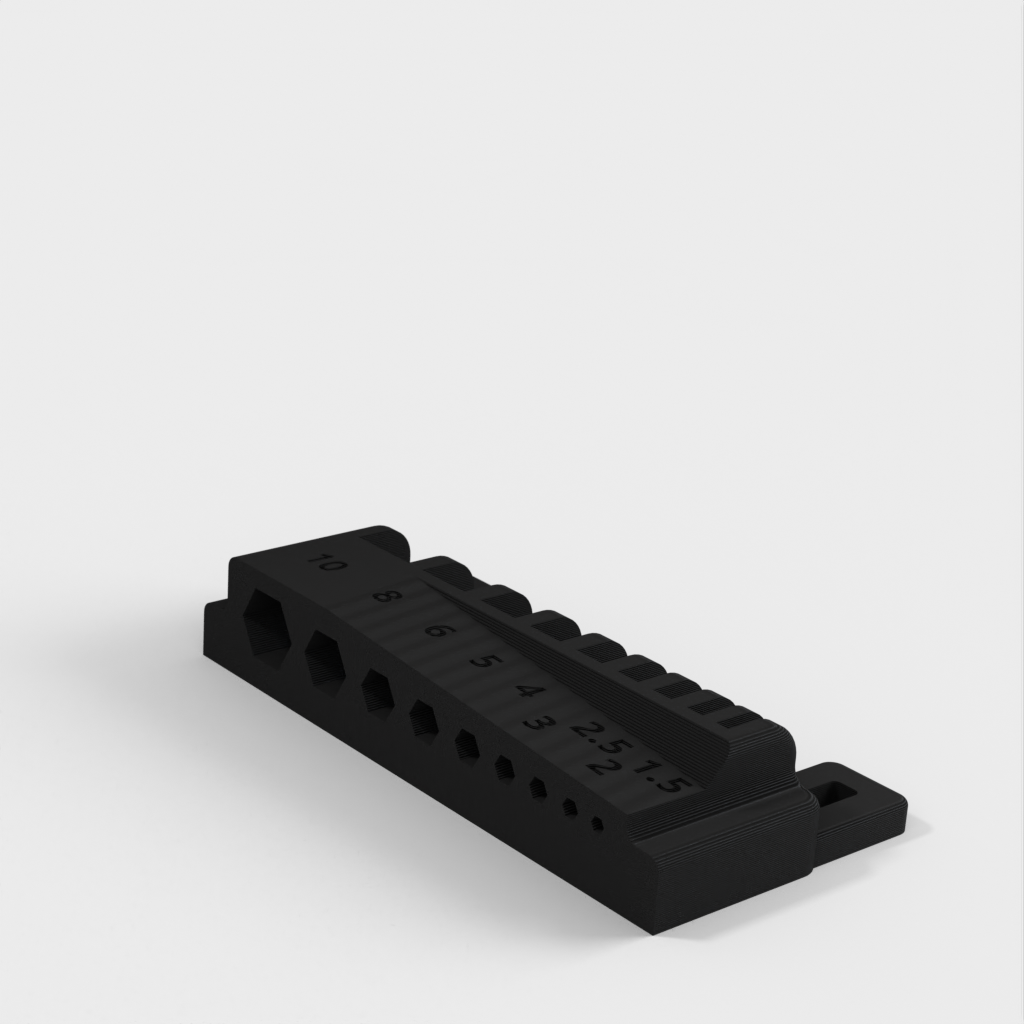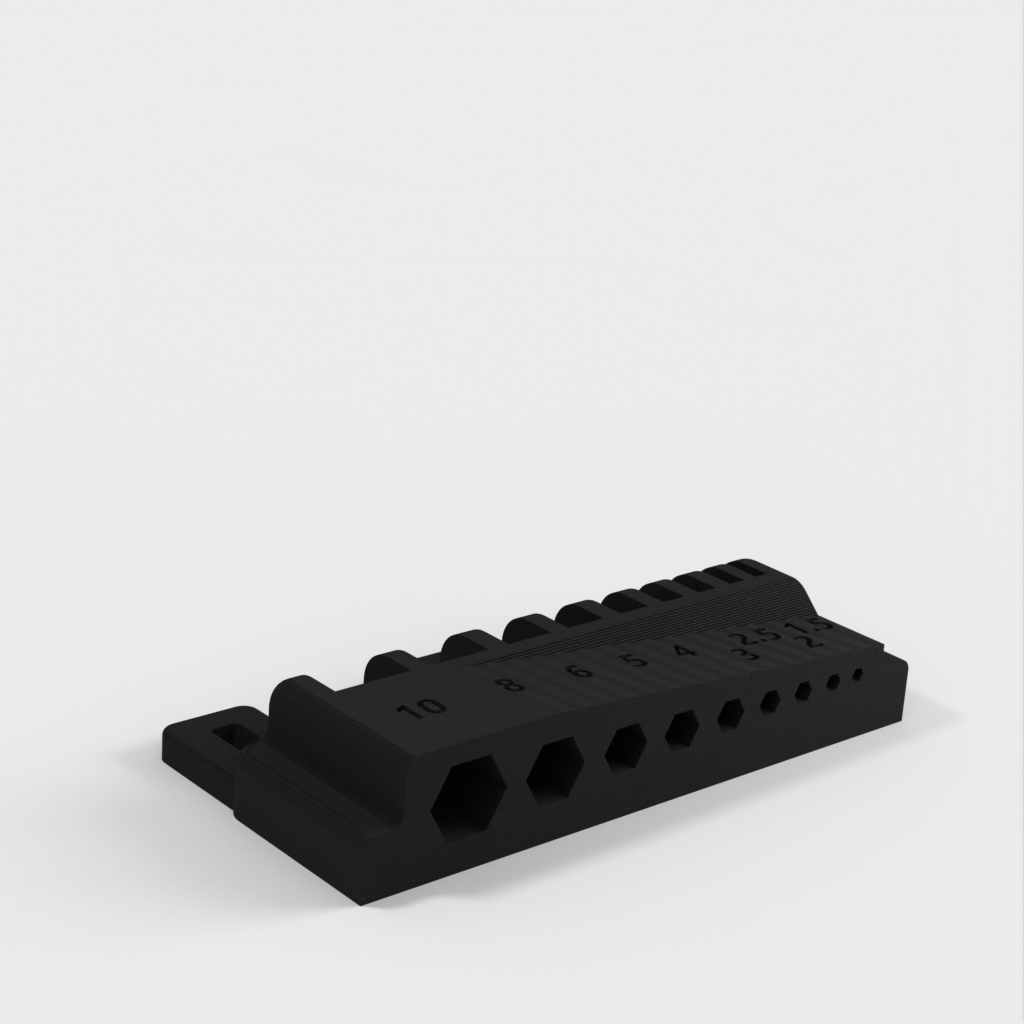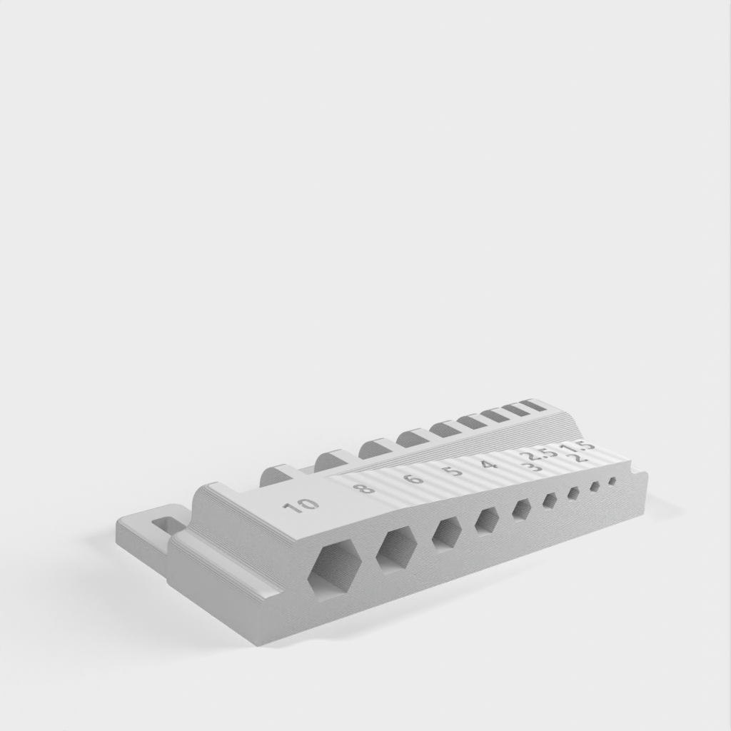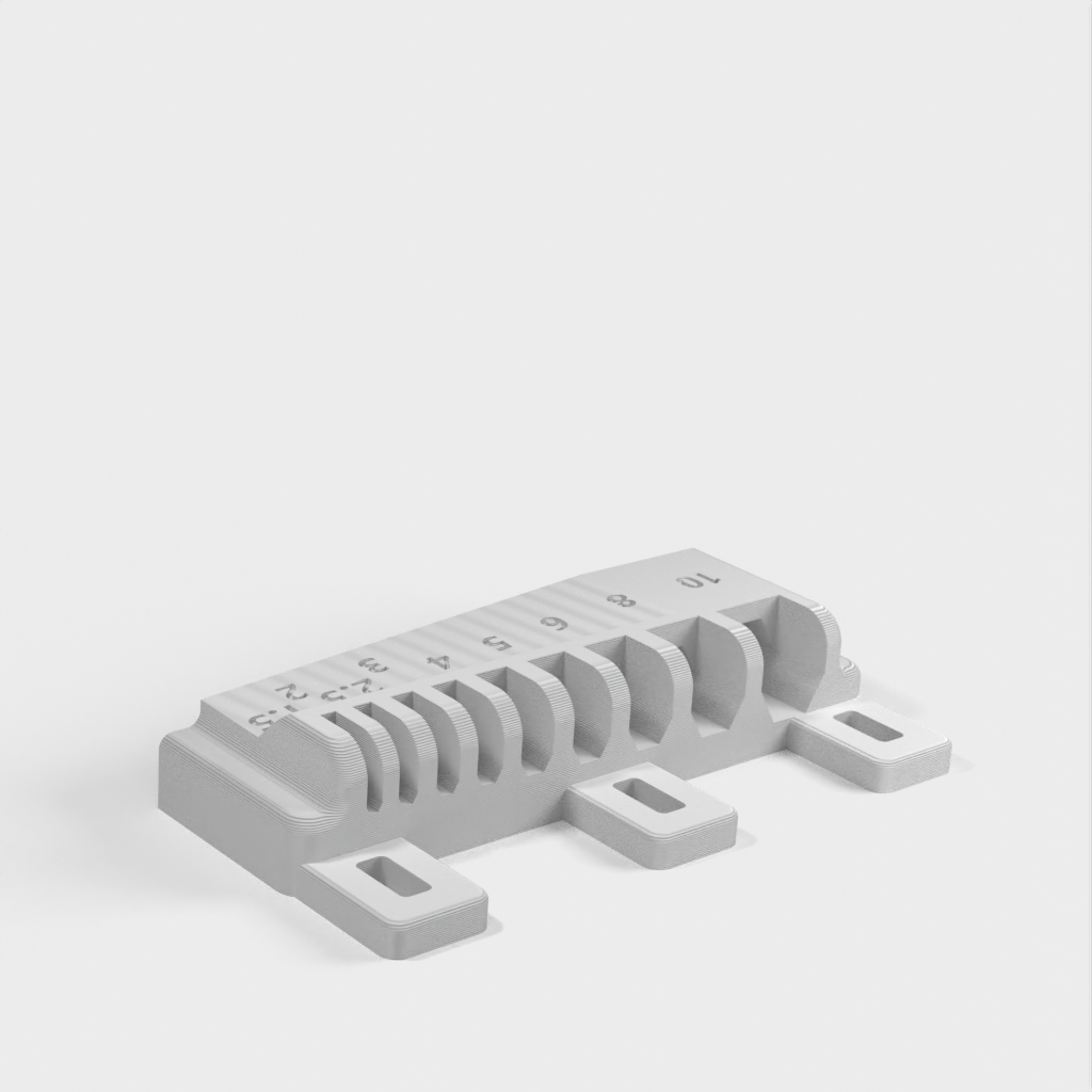 Insexnyckelhållare Skadis är en uppsättning nyckelhållare designade för att hantera insexnycklar. Den har siffror för att indikera storlekarna för enkel identifiering och placeras enkelt på vilken IKEA Skådis/Skadis panel som helst. Den här designen är lite mer fancy eftersom en del av fronten är avskuren i vinkel för att spara lite material.