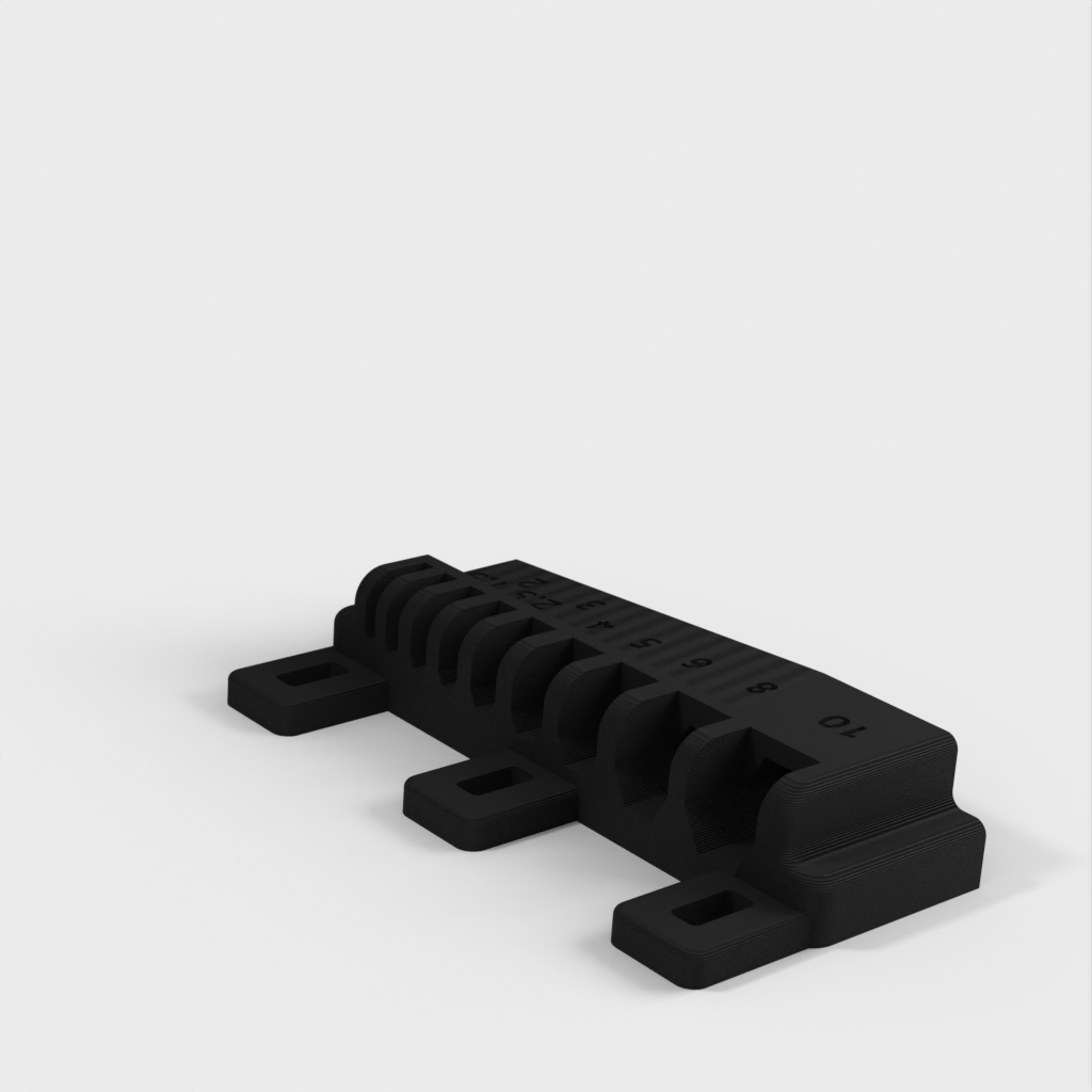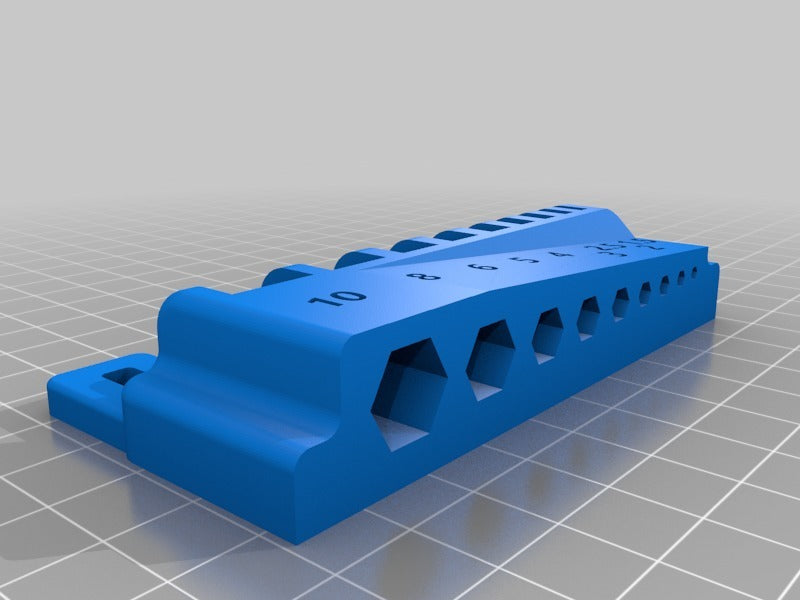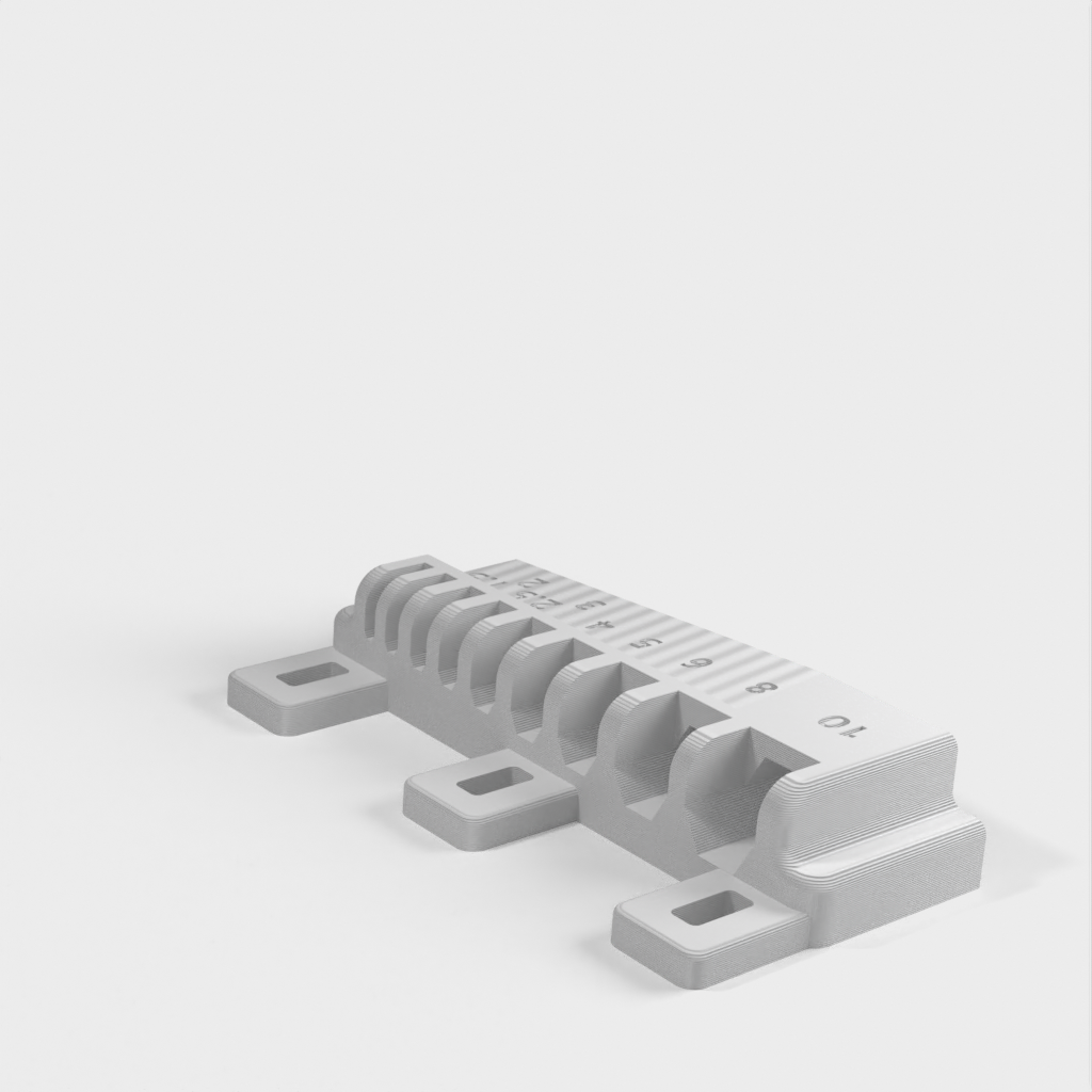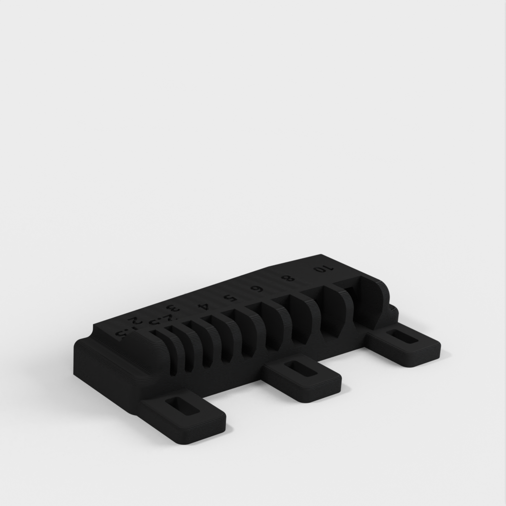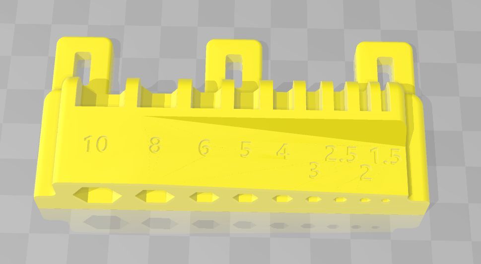 Insexnyckelhållare Skadis är en uppsättning nyckelhållare designade för att hantera insexnycklar. Den har siffror för att indikera storlekarna för enkel identifiering och placeras enkelt på vilken IKEA Skådis/Skadis panel som helst. Den här designen är lite mer fancy eftersom en del av fronten är avskuren i vinkel för att spara lite material.