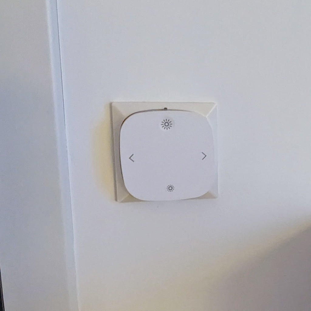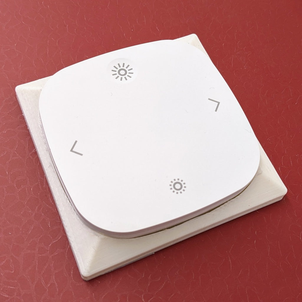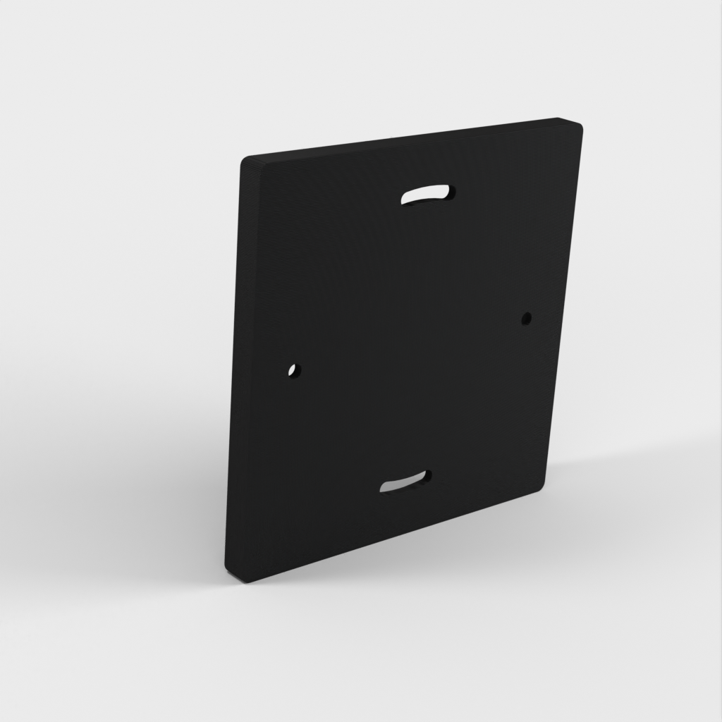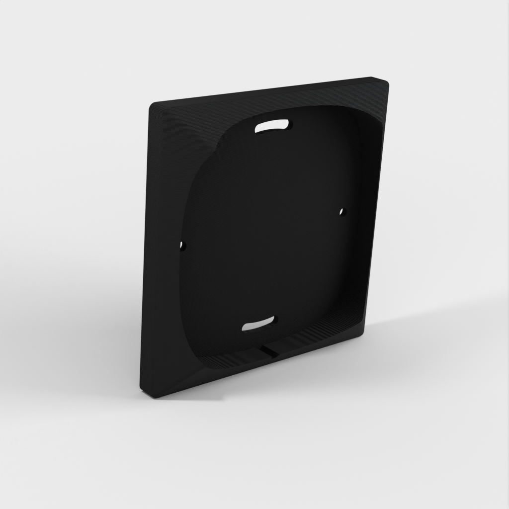 STYRBAR Väggfäste är ett fäste för IKEAs STYRBAR smarta hem-fjärrkontroll, designat för att enkelt ersätta den normala ljusströmbrytarens placering. Denna modell har hål för att montera den på en standard "Unterputzdose" (~inbyggd låda). Och eftersom vår är sned i väggen är de vertikala hålen slitsade.
