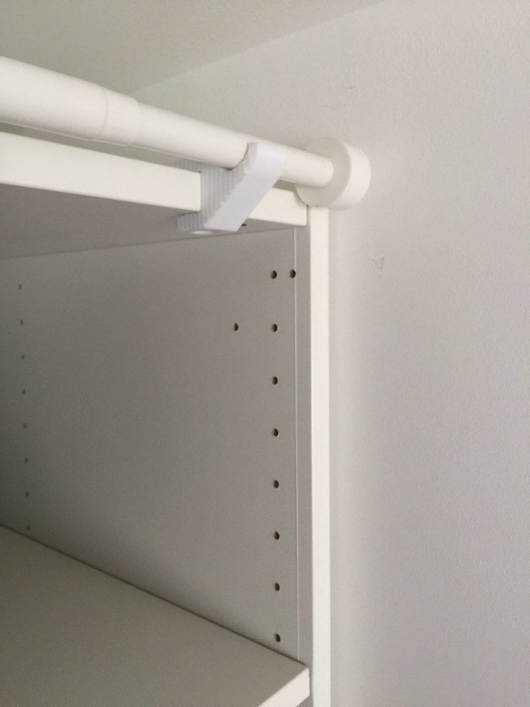 Detta är ett gardinstångsstöd utan att man behöver borra. Den är designad för att passa tjockleken på ett IKEA-skåp och möjliggör enkel installation av din gardinstång utan att använda skruvar. Den passar skåp med en tjocklek på 18mm, men en fil har även lagts till för 15mm tjocka skåp.