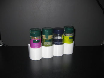 En enkel hållare för fyra kryddburkar. 42 mm hög och 183 mm bred med en maximal diameter på 43 mm burkar. Med denna hållare kan du enkelt förvara dina kryddor och skapa en snygg köksmiljö.