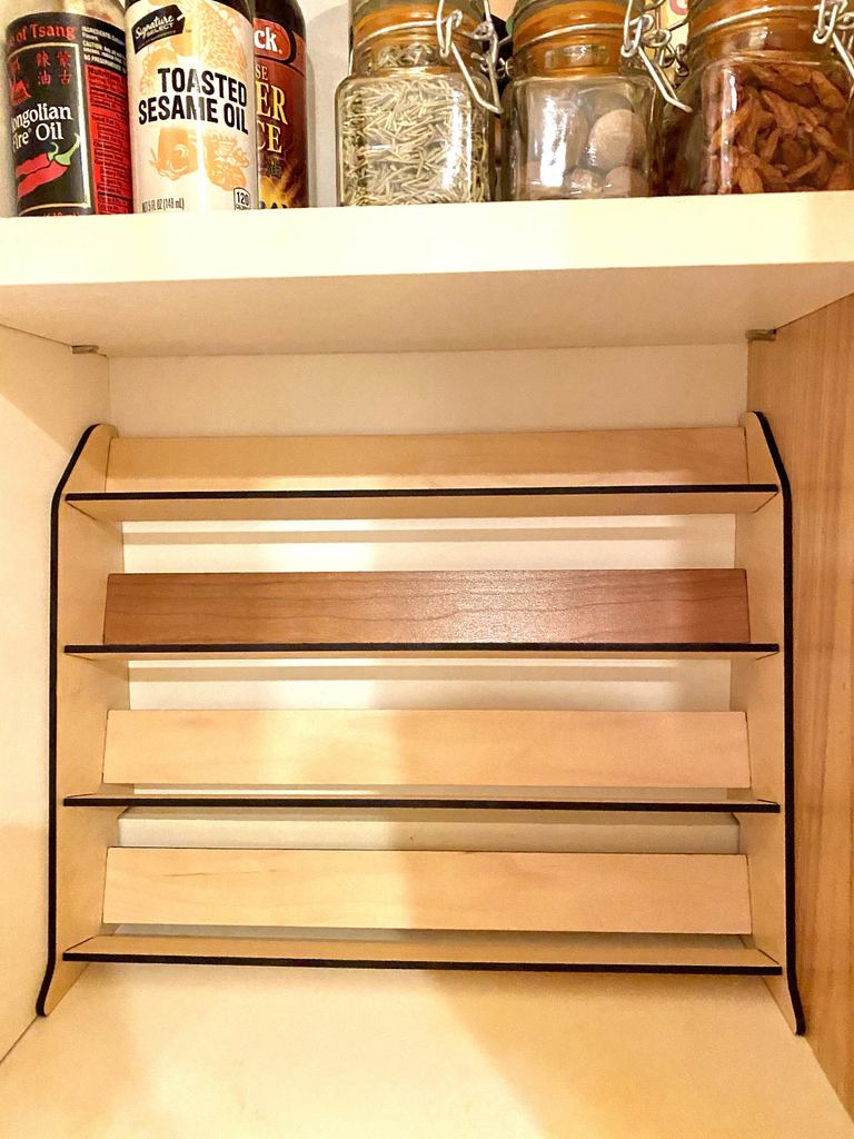 Denna praktiska kryddhylla är utformad för att optimera utrymmet i ditt köksskåp och hålla dina kryddor organiserade och lättillgängliga. Hyllan är speciellt utformad för att rymma vanliga 5 cm burkar, vilket ger ett enhetligt och prydligt utseende till ditt kök.