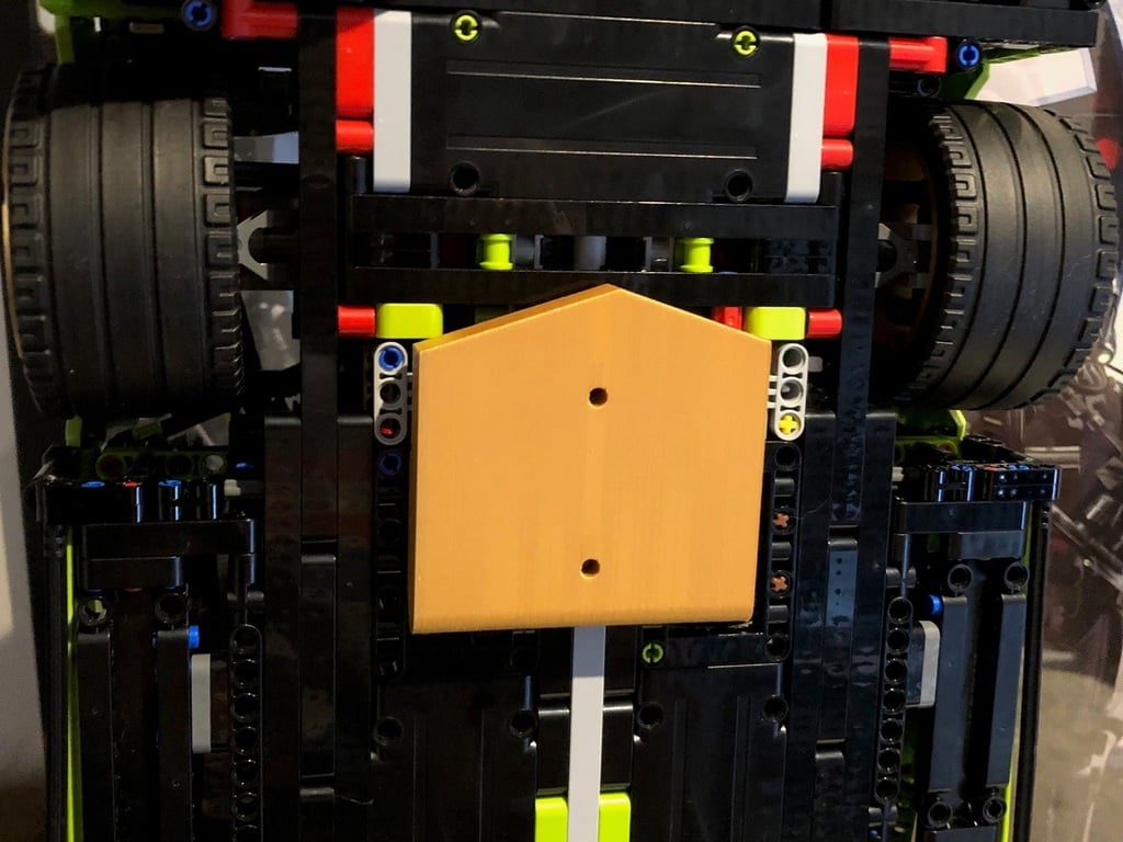 Detta är ett 3D-utskrivet väggfäste för en Lego Lamborghini Sián FKP 37. Monteringskrokar trycks in i de två hålen i bilens botten. Lägg märke till pilen högst upp på monteringsplattan som indikerar var bilens mittaxel kommer att vara.