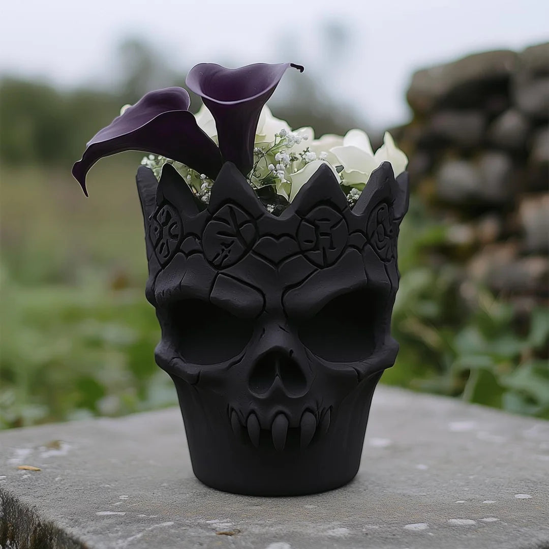 Gör ett djärvt uttalande i ditt hem med denna gotiska vas med dödskallekrona. Denna iögonfallande vas, designad med en detaljerad dödskalle toppad med en elegant krona, är det perfekta tillskottet för dig som vill införliva en mörk och edgy estetik i sin heminredning. Vasen är inte bara ett funktionellt föremål för blommor eller torkade växter, utan också ett konstnärligt element som kan stå ensam som en imponerande del av din inredning. Dess distinkta design och invecklade mönster skapar en mystisk dragningskraft som fångar ögat. Oavsett om du vill förbättra en gotisk stil, lägga till en kuslig atmosfär till Halloween eller helt enkelt uppskatta unika konstverk, kommer denna dödskallevas att fungera som en anmärkningsvärd samtalsstartare och mittpunkt i ditt utrymme. Genom att kombinera mörk elegans med konstnärlig stil är den idealisk för dig som söker djärva och personliga inredningsval.