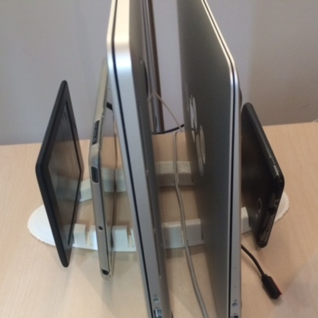 Vertikalt stativ för 5 apple-enheter. T.ex. en Macbook Pro Retina 15, Macbook Air 13, Kindle Paperwhite, iPad och iPad mini. Har även kabelspår så att laddkablarna inte flyger från skrivbordet när du kopplar ur.