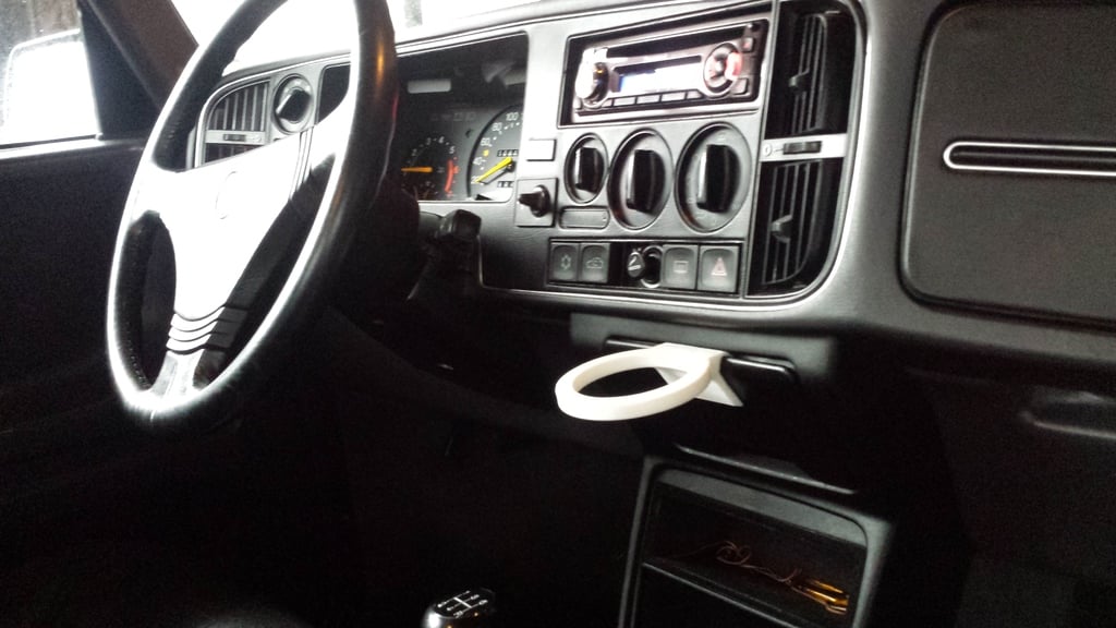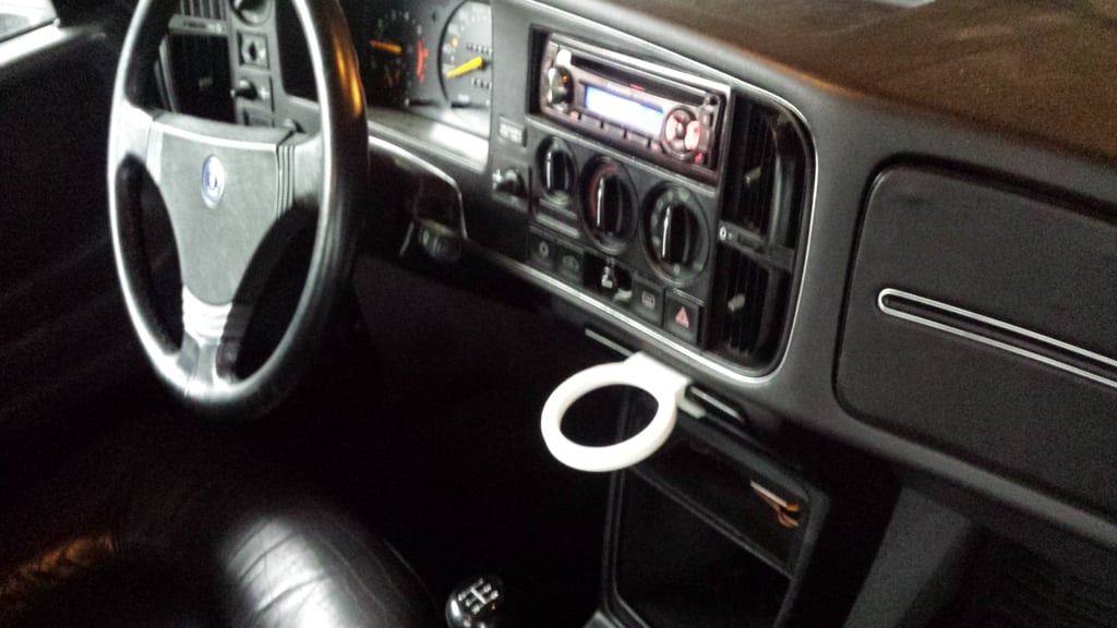 Här är en mugghållare till klassiska SAAB 900. Mugghållaren klickas fast på askkoppen och kommer att rymma de flesta storlekar av dryckesbehållare. Det borde fungera för alla C900 från 1978 - 1993.
