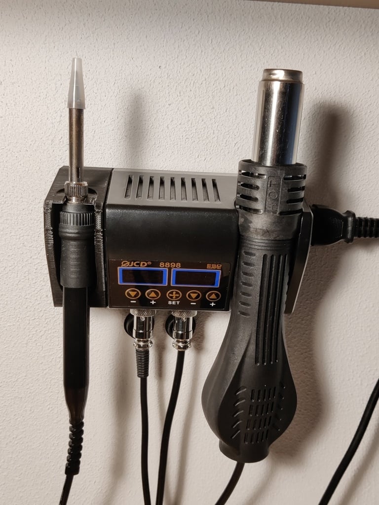 Hållare för JCD 8898 lödkolv från SMD rework station. Den klickar fast i botten av stationen och passar fint på sidan av stationen. Lödkolven passar bra i skåran och faller inte ut.
