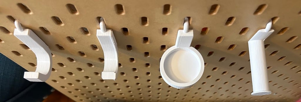 Detta är en samling specialdesignade pinnar för IKEA SKÅDIS pinnboard. Varje pinne är designad för att passa olika verktyg och föremål med olika dimensioner. Pekarna inkluderar en längre krok för bredare föremål, en hållare för spole eller bandrulle och en speciell rund som kan användas för att hänga en värmepistol. Dessutom finns krokens bas också tillgänglig separat, som kan anpassas efter dina specifika behov. Varje krok och hållare är designad för att passa perfekt med IKEA SKÅDIS hål för pinnbrädor som mäter ca. 6 mm och placeras 34 mm från varandra.