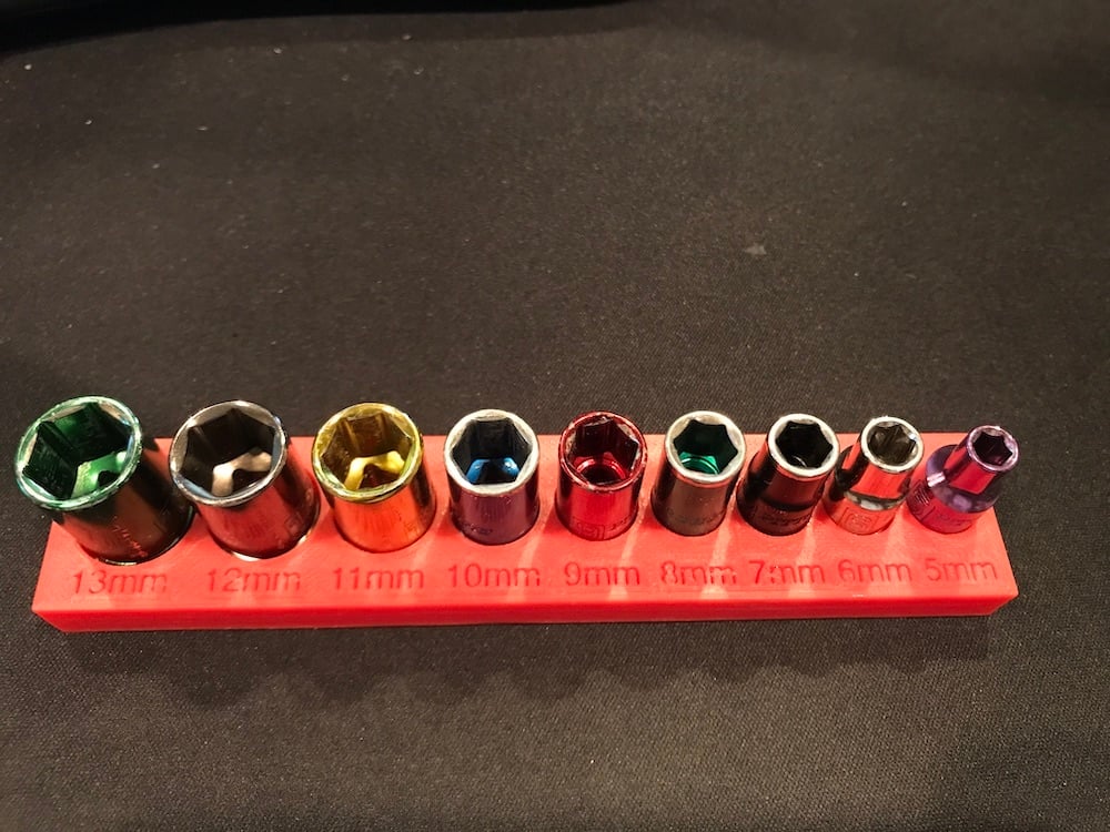 Denna praktiska organisatör är utformad för att hålla dina metriska hylsor med 1/4"-fäste organiserade och lättillgängliga. Den kan säkert förvara hylsor i storlekar från 5 mm till 13 mm, vilket gör den idealisk för många vanliga hylsnyckelsatser. Med inbyggda platser för 6 mm x 1,5 mm N52 neodymmagneter är dina hylsor effektivt säkrade så att de håller sig på plats även när de förvaras upprätt eller upp och ner. Organiseraren är kompatibel med populära märken som Craftsman och Harbor Freight. Den bidrar till en renare arbetsyta där du snabbt kan hitta rätt hylsa när du behöver den, och minskar risken för att tappa bort dina hylsor.