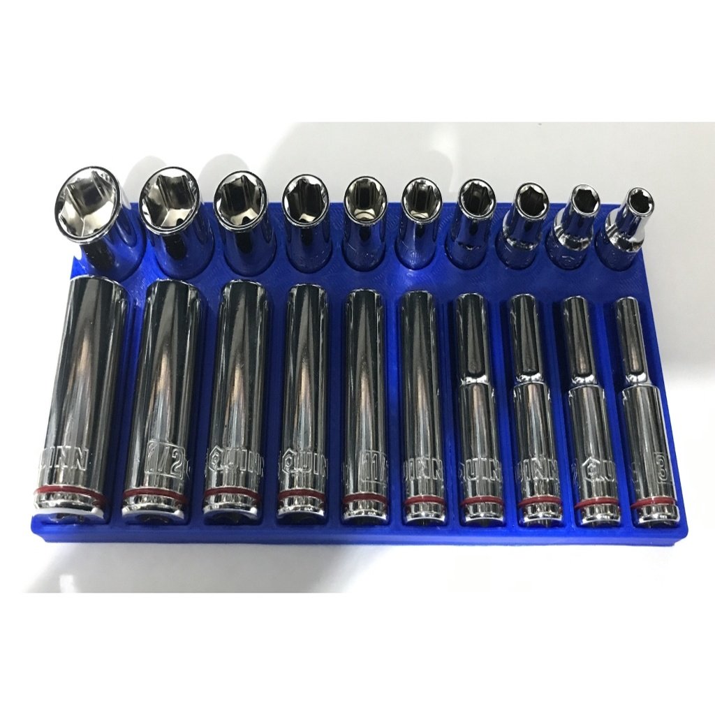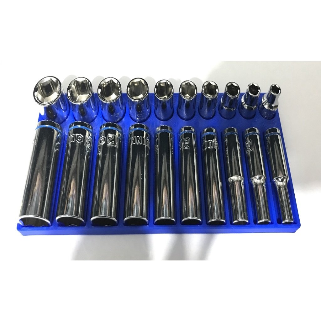 Dessa hylshylsor för 1/4" är utformade för att förbättra organiseringen av din verktygslåda för både metriska och SAE-storlekar. De hjälper till att systematiskt förvara dina hylsor, vilket gör dem lättare att hitta och komma åt under arbetet. Designen stöder både standard- och djupa hylsor.